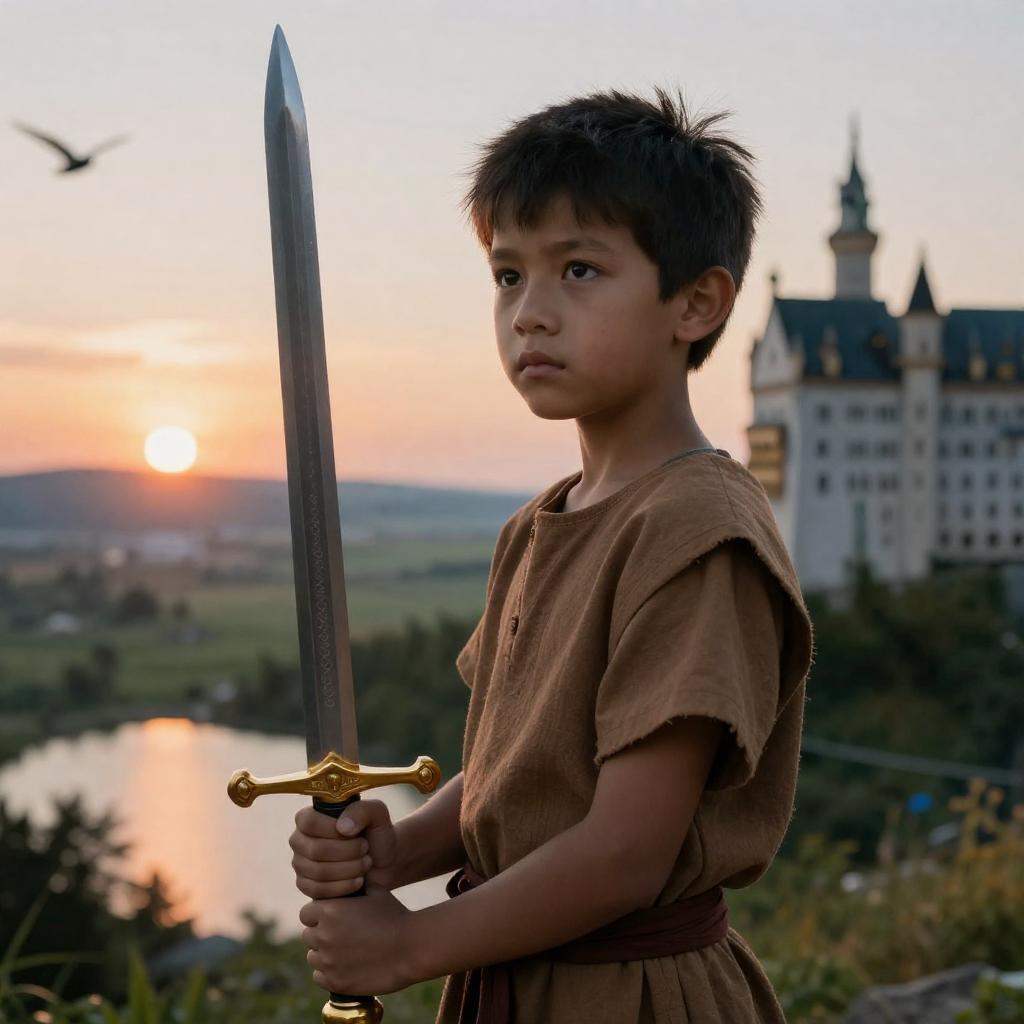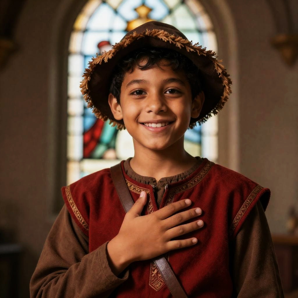 Young boy with medium brown skin, smiling, wearing a brown and red medieval-style shirt with a decorative vest, and a brown hat with fringed edges. Background features a blurred, colorful, oval stained-glass window. Boy's right hand clasps his chest. Warm indoor lighting.
