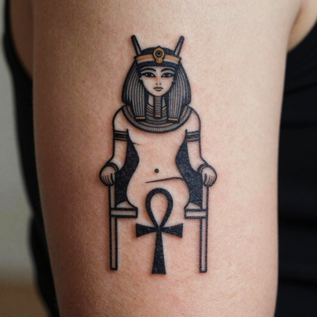 A photograph of a black ink tattoo on light skin. The tattoo features an ancient Egyptian-style goddess with a black bob hairstyle, wearing a crown with an eye symbol, a striped collar, and arm bands. She is seated on a chair, with her hands resting on the chair's arms. She is nude, with an ankh symbol at her waist. The goddess has a calm expression with detailed, linear shading. The background is blurred, focusing attention on the tattoo. The skin surrounding the tattoo is smooth and slightly reddened.