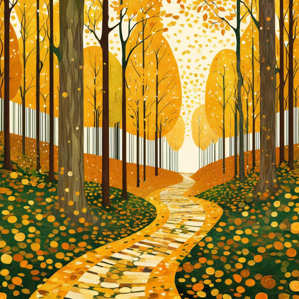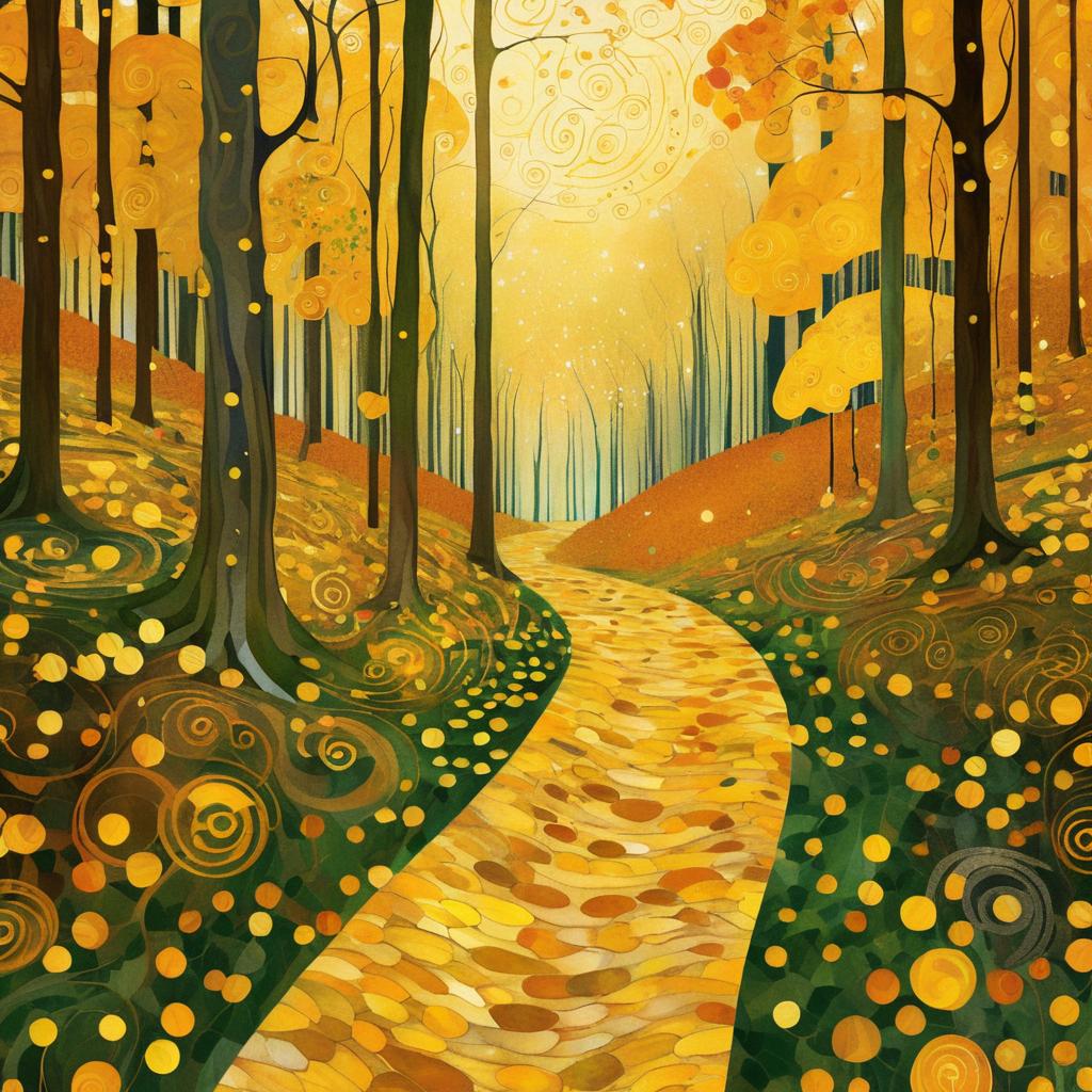 Detailed illustration of autumn forest trails by Gustav Klimt, showcasing a serene landscape.