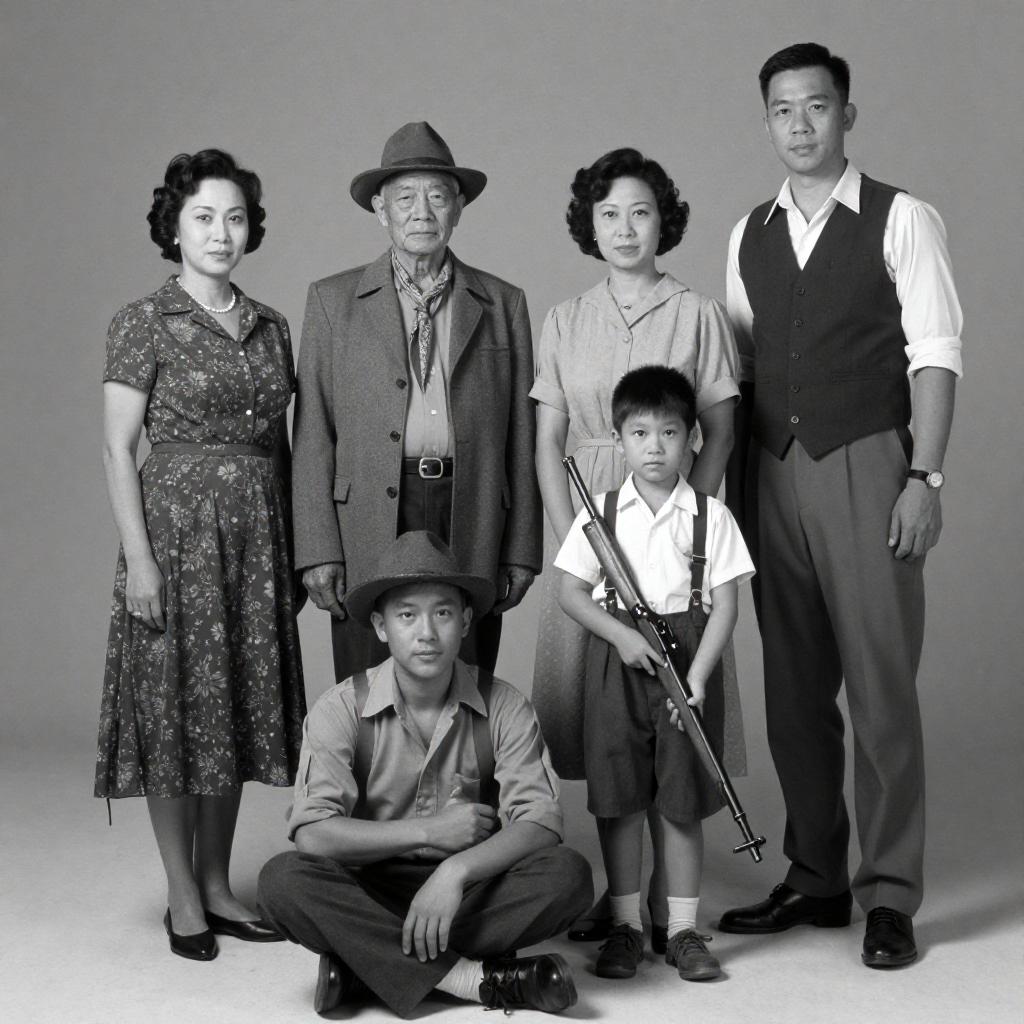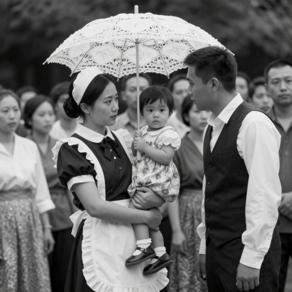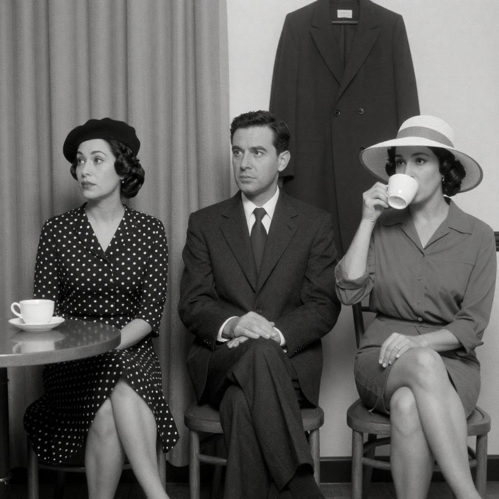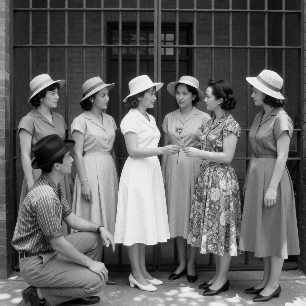 Black-and-white photograph of women in vintage dresses and hats standing in front of prison bars. Central figure in a white dress being handed a flower by a woman in a patterned dress. Six women in total, varied hairstyles and patterns. One man in a dark hat and striped shirt kneeling on the left. Sunlight casts shadows on the ground. Facial expressions range from neutral to slightly smiling. Background includes brick walls and barred windows.
