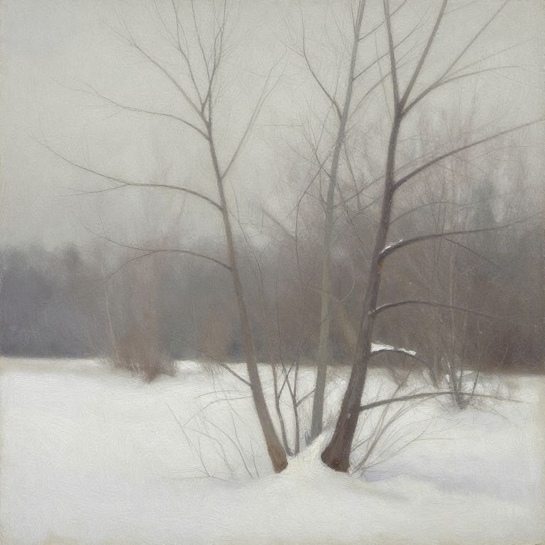 Oil painting trees in a quiet winter landscape, stark bare branches against a snowy background, subtle muted colors and soft blending techniques conveying cold stillness, capturing delicate shadows and the fragile mood of a cold season.