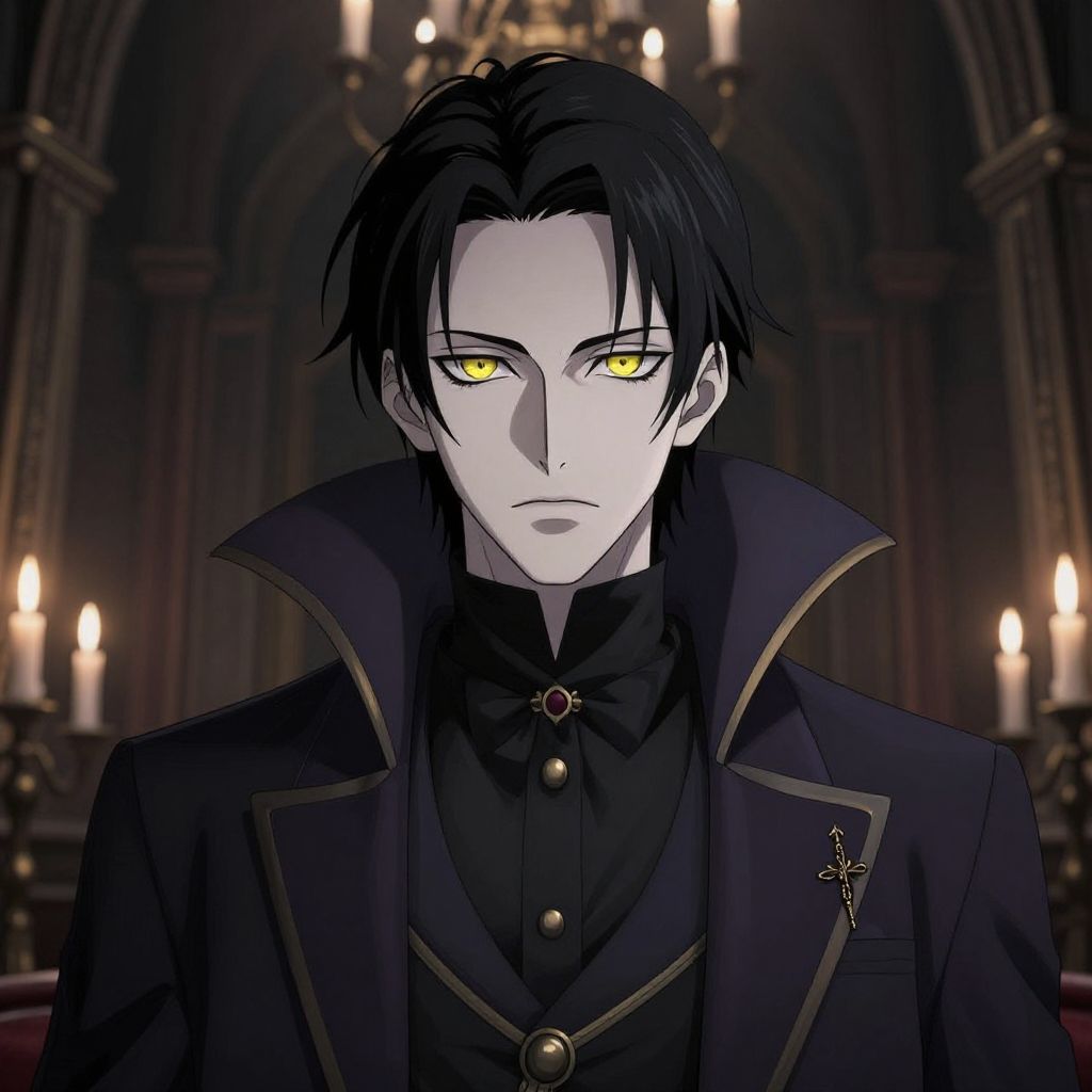 Portrait of an anime vampire with piercing yellow eyes and pale skin, dark elegant attire in a gothic mansion filled with candlelight, moody and atmospheric scene with detailed character design and textures.