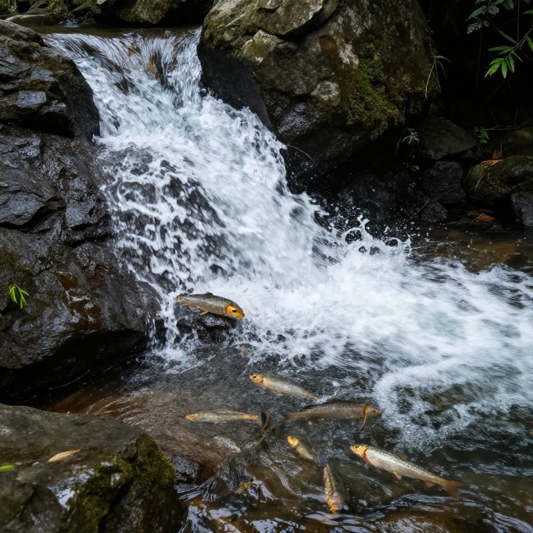 Photograph of a small, rocky waterfall with white cascading water, surrounded by dark rocks and yellow-bellied fish swimming below.