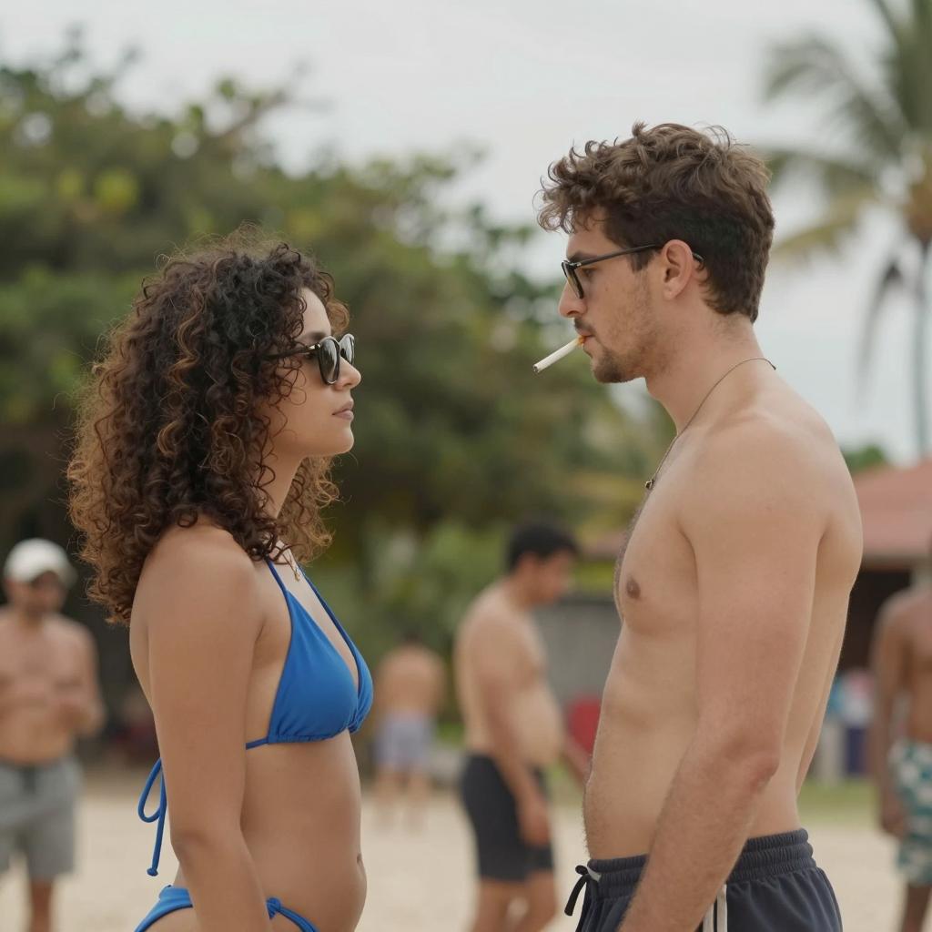 Photograph of four people at a sunny beach. Three men stand together, two shirtless, one with a pineapple-shaped ice cream, one wearing a floral shirt, one in a light green shirt. One woman in a pink bikini stands in front. Green mountains and umbrellas in the background. The man in the center smiles, the man in the floral shirt gestures, the man in the green shirt laughs, and the woman's back is to the camera.