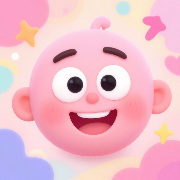 Digital illustration of a cute, pink, round-faced cartoon character with large, expressive eyes, brown eyebrows, and a happy, open-mouth smile. Background
