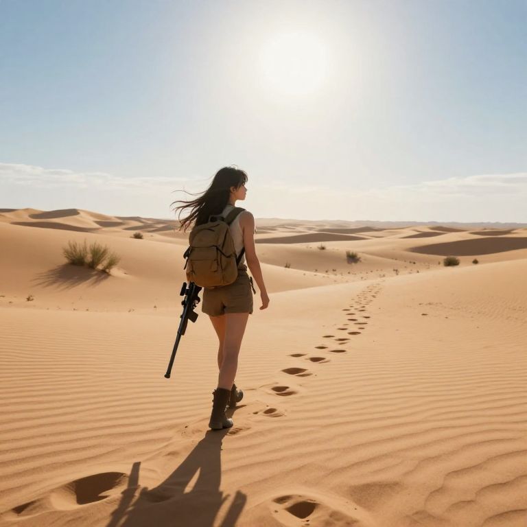 Photograph of a lone female hiker with long dark hair, wearing a beige backpack, brown shorts, and black boots, walking through a sunlit desert. She carries a rifle in her right hand. Her shadow stretches ahead on the rippled sand. The background features rolling sand dunes under a clear blue sky. Sparse grass tufts dot the landscape. The sun is positioned high, creating strong shadows and highlighting the texture of the sand. The hiker is viewed from behind, adding a sense of mystery and adventure.