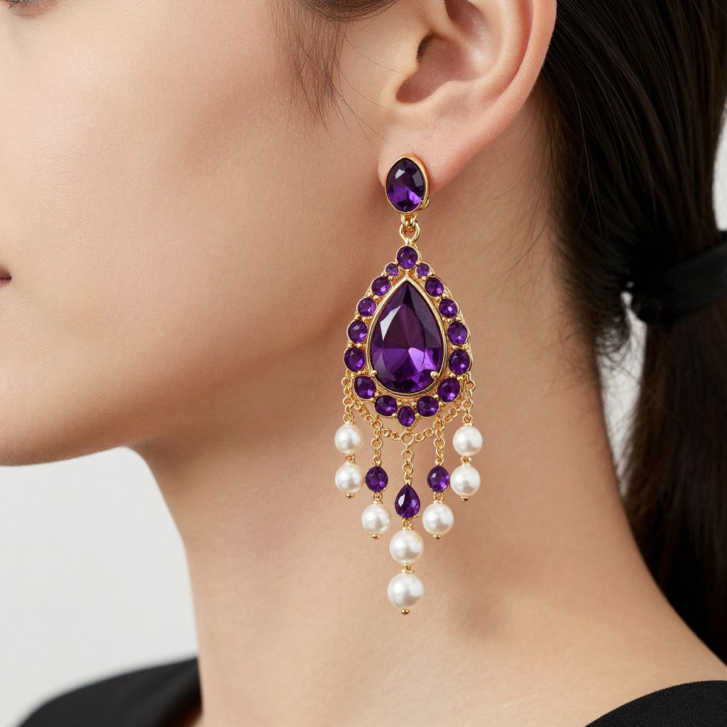 Woman wearing elegant gold-framed earrings featuring a central amethyst teardrop surrounded by smaller purple gemstones, cascading into dangling fringe embellished with pearls and additional amethyst accents.