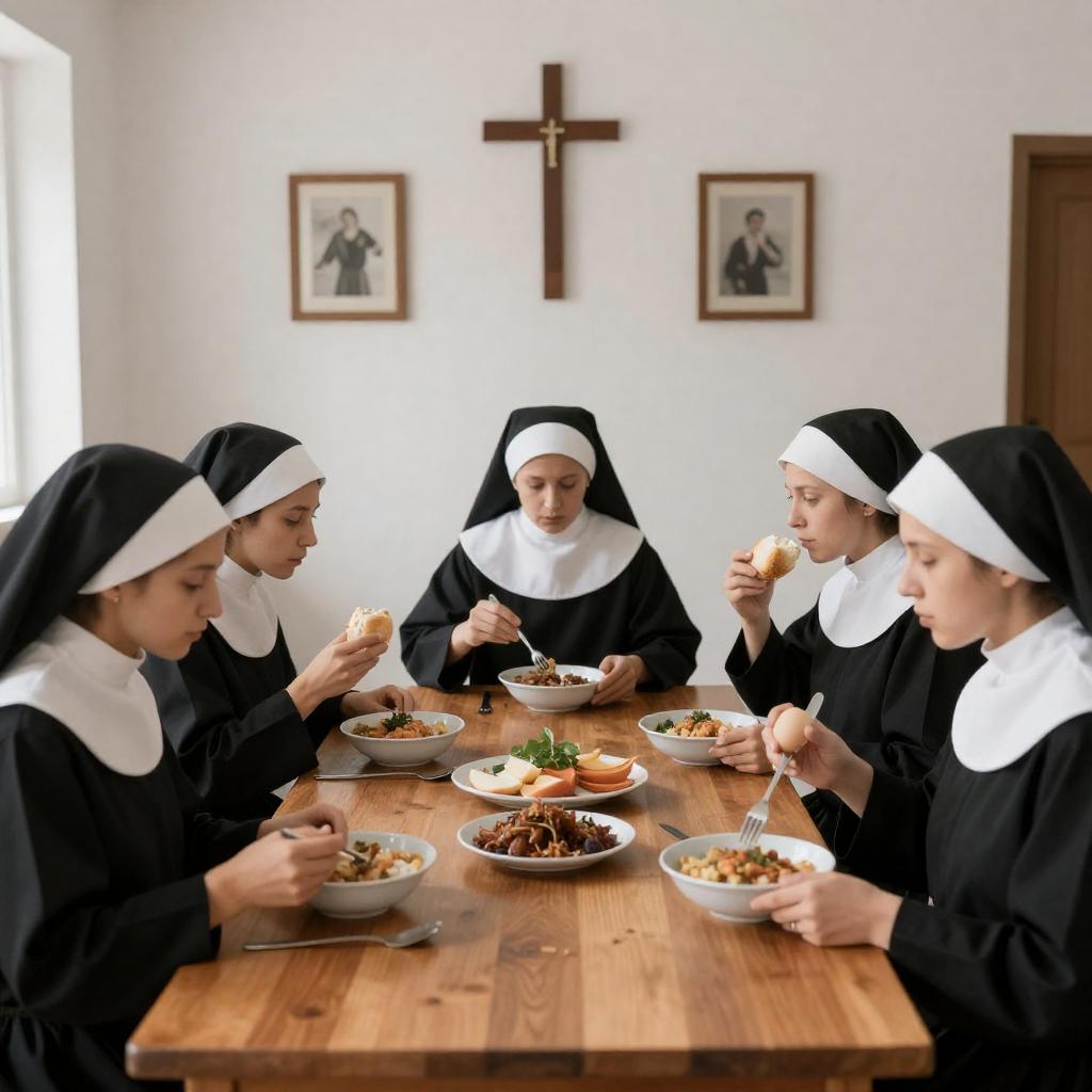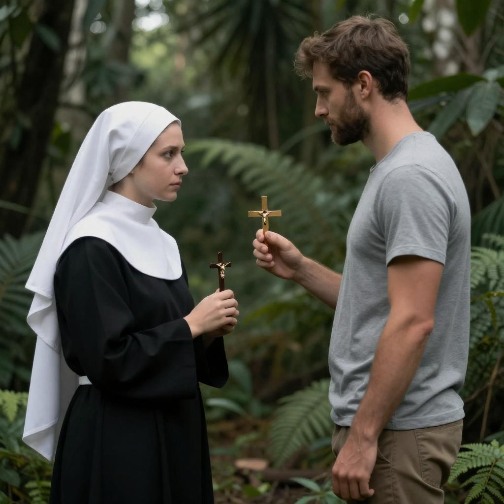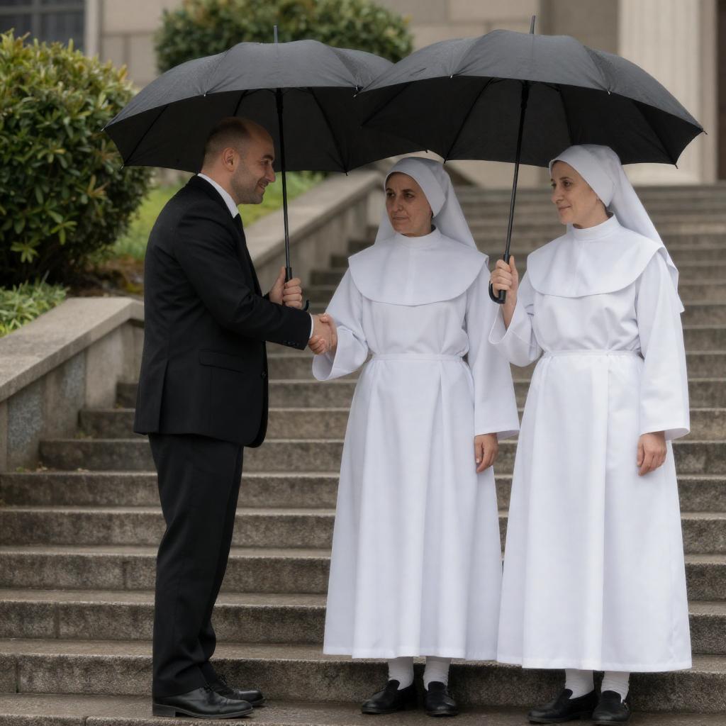 Man Taking Pastry from Nun on City Street