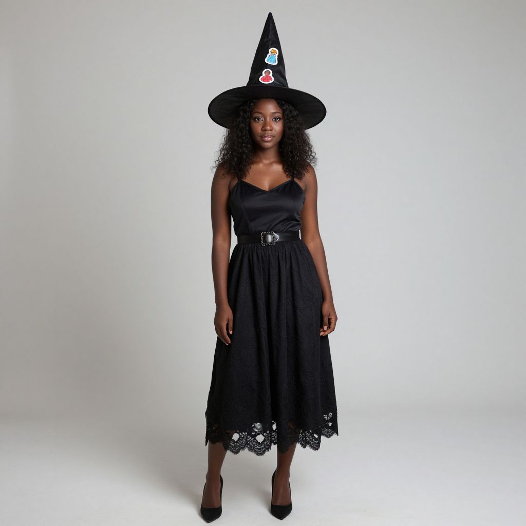 Photograph of a Black woman with dark skin and curly hair, standing against a plain white background. She wears a black, sleeveless, floor-length dress with lace trim at the hem and a black belt with a decorative buckle. On her head is a black, pointed witch hat adorned with colorful circular patches. She stands straight, looking directly at the camera with a neutral expression. She is also wearing black high-heeled shoes. The overall style is whimsical and Halloween-themed.