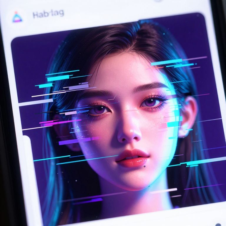 Digital portrait of a young woman with glowing blue and purple lines across her face, set against a dark background on a computer screen.