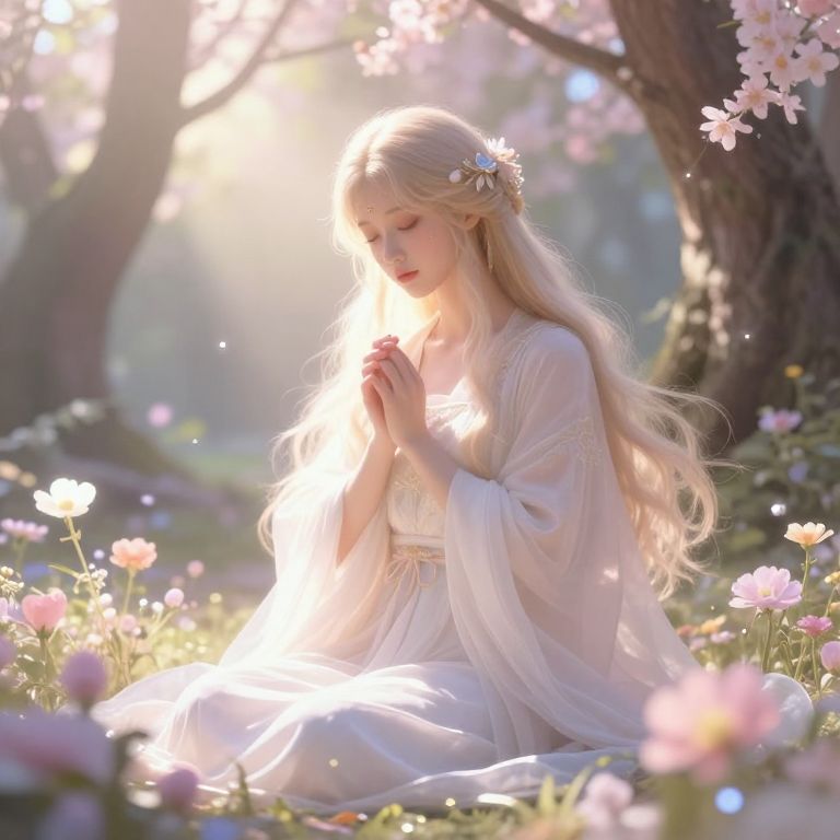A woman dressed as Brigid, the goddess of poetry, healing, and smithing, sits serenely in an orchard with blossoming trees. She wears a flowing teal dress, a floral crown, and a white veil. Her eyes are closed, and her hands are raised gently as if healing the orchard. Surrounding her are woven baskets filled with oranges and open books, symbolizing knowledge and nature's bounty in a mystical, dreamlike setting.