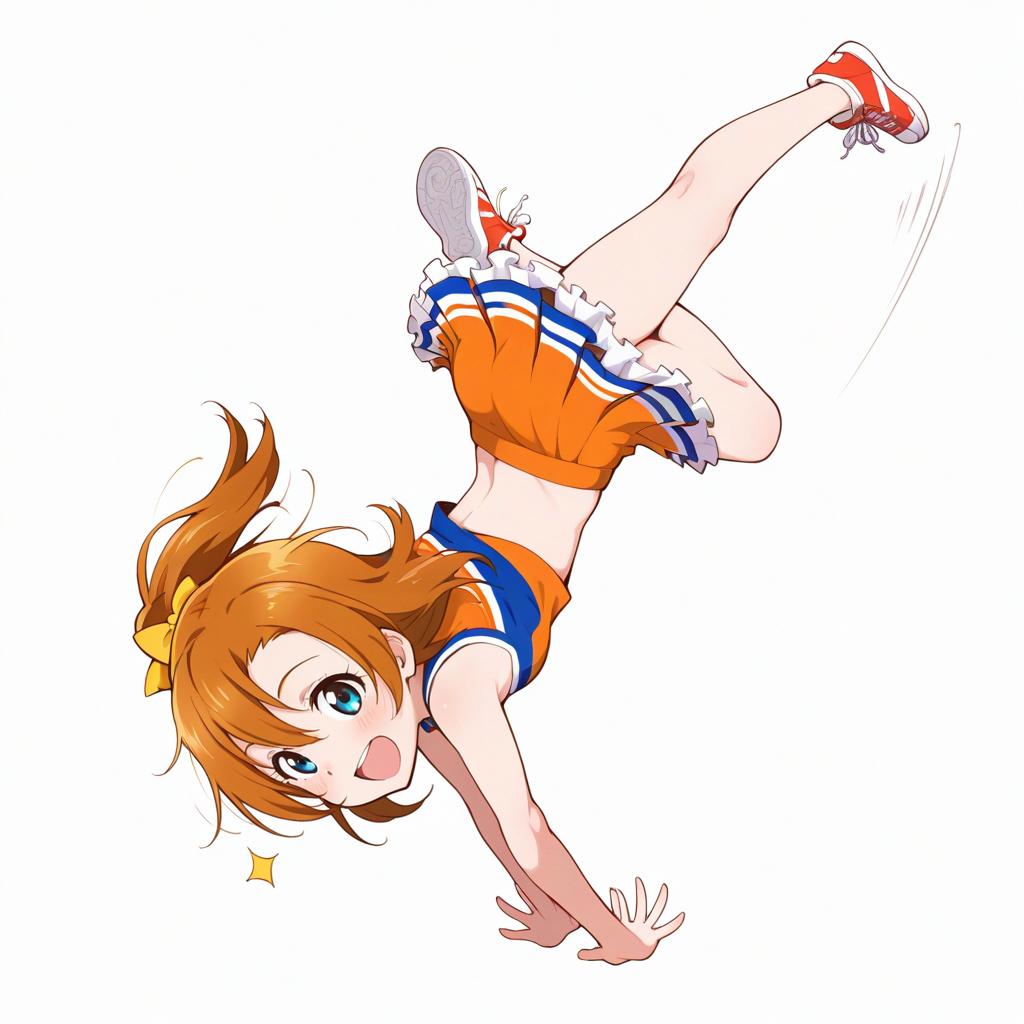 Masterpiece, best quality, (1girl), (LLChar), (kousaka honoka:1.1), (orange hair, blue eyes), cheerleader, jumping, white background, epic, frilled skirt, crop top, midriff, happy, sneakers