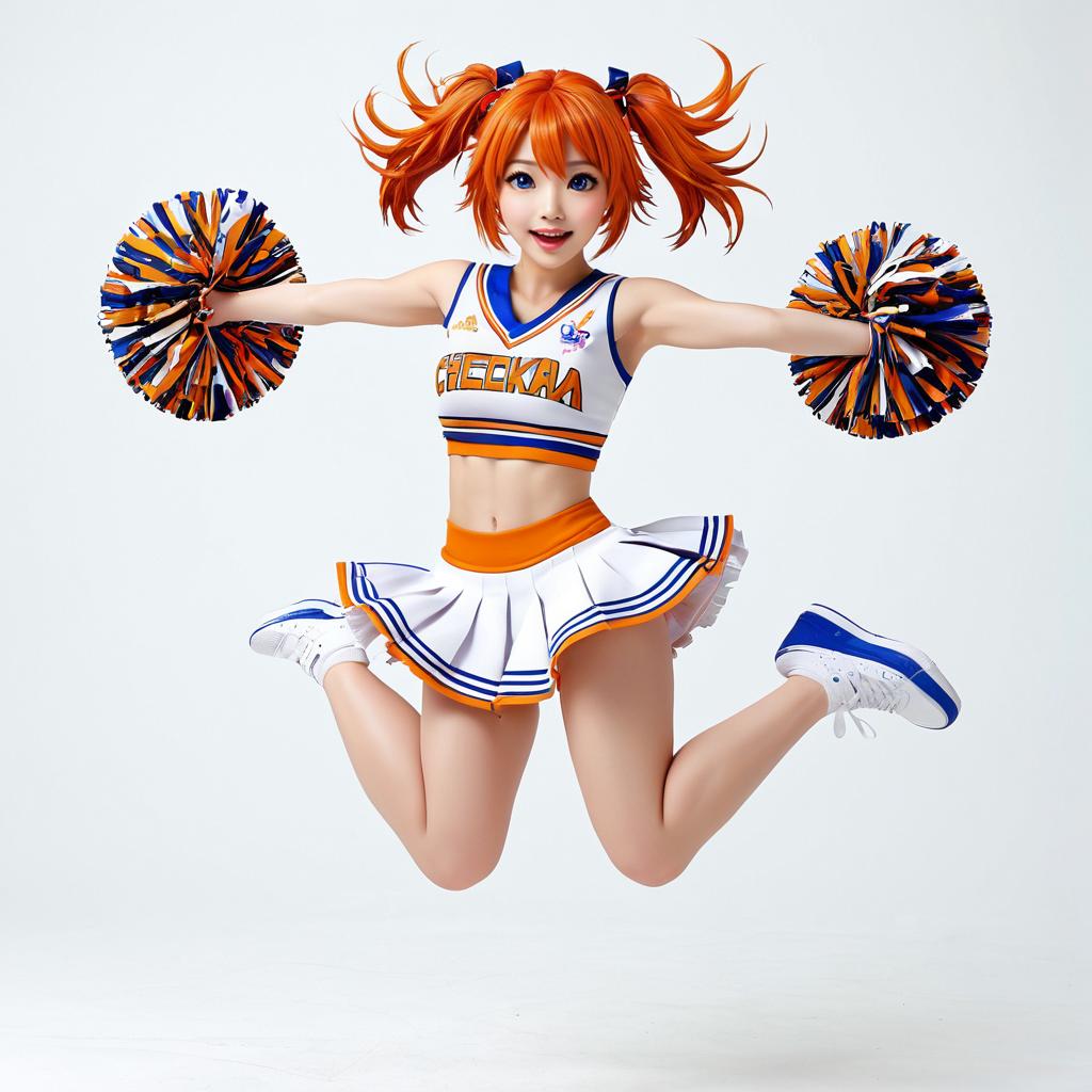 Colorful anime-style illustration of a cute, orange-haired girl with green eyes, wearing an orange and blue cheerleader outfit, mid-air jump, smiling