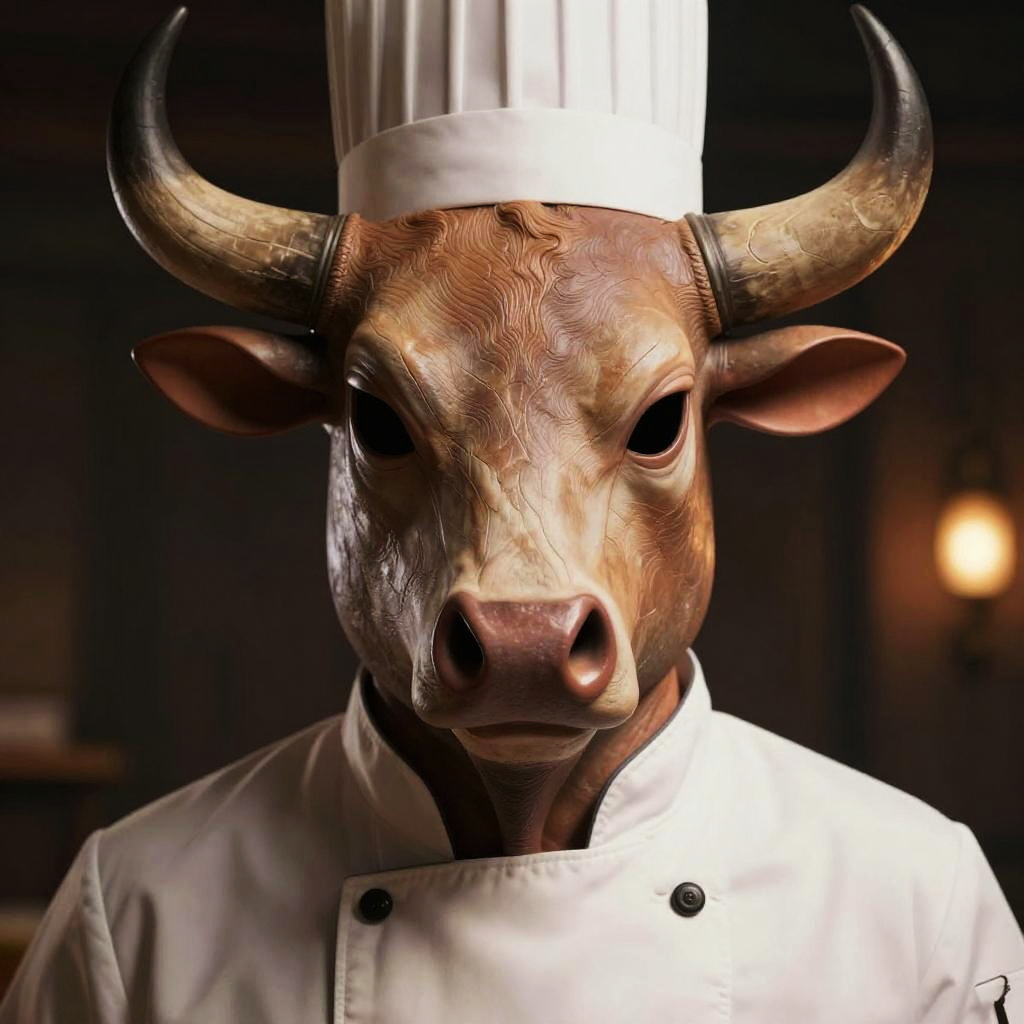 Hyperrealistic dslr film still of Chef as a bull mask, stunning 8 k octane comprehensive 3 d render, inspired by istvan sandorfi & greg rutkowski & unreal engine, perfect facial symmetry, dim volumetric cinematic lighting, extremely hyper - detailed, incredibly real lifelike attributes & flesh texture, intricate, masterpiece, artstation, stunning