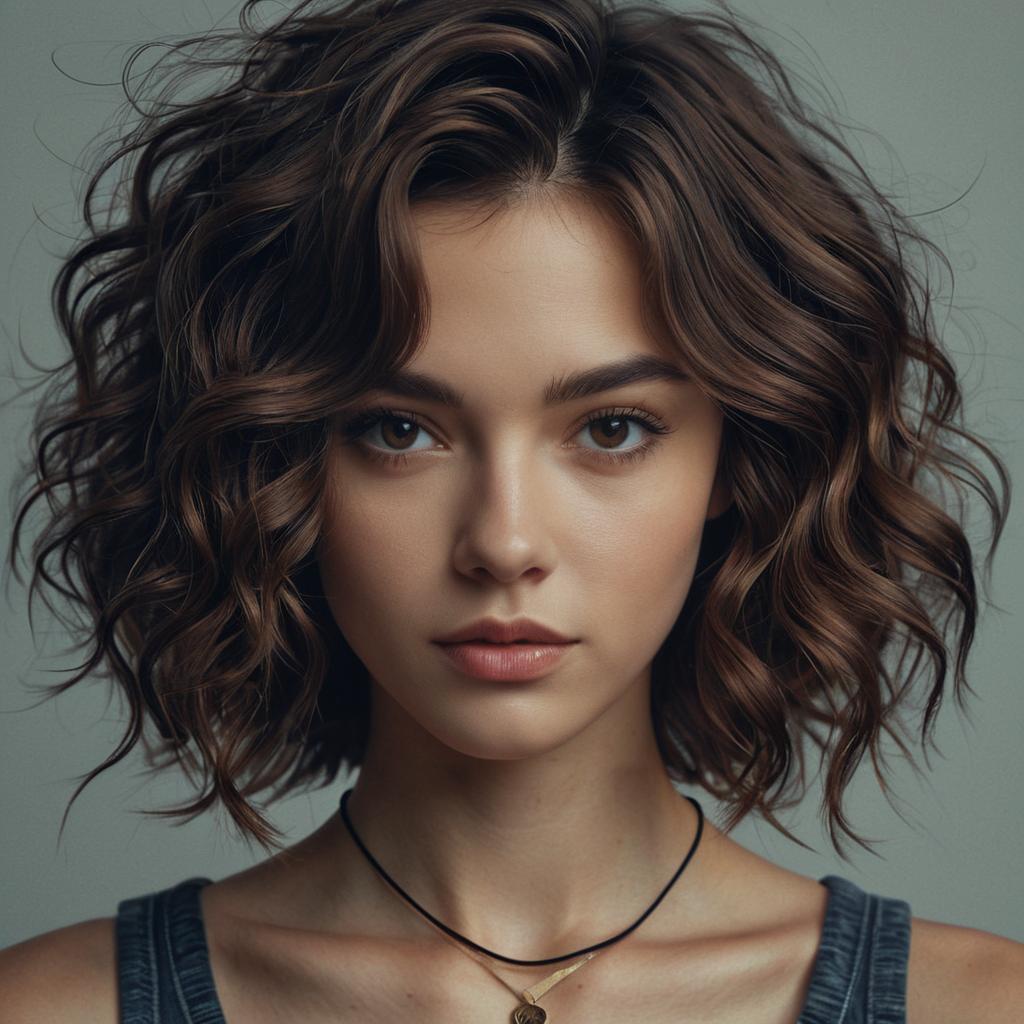 Close-up portrait of a young woman with soft warm eyes and wavy brown hair styled in a modern fashion. She wears a dark tank top and a delicate black necklace with a gold pendant, set against a neutral gray background. The image features soft lighting and muted colors, highlighting the subject's symmetrical face and natural beauty.