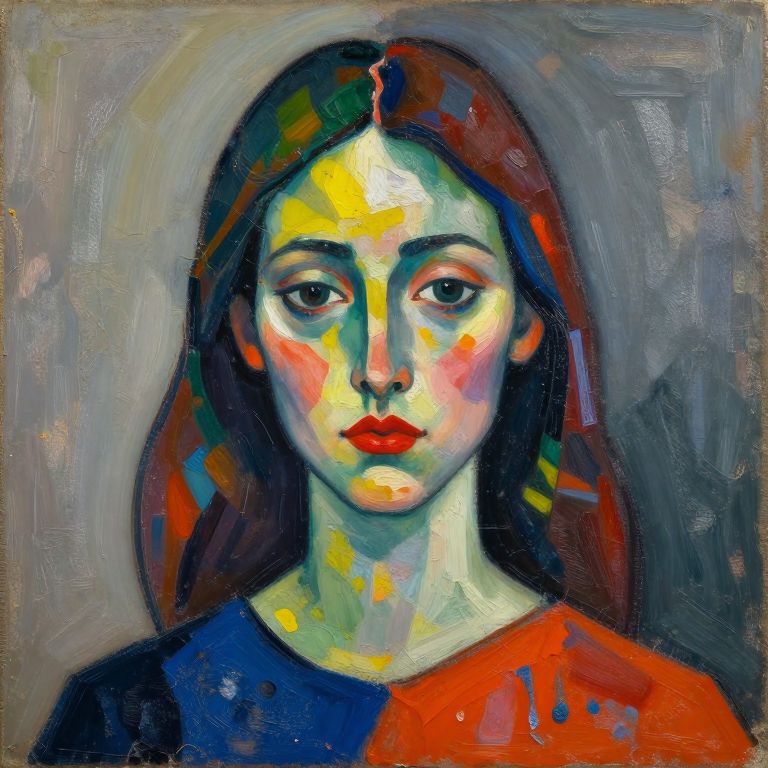 Vibrant, expressive oil painting of a woman with long dark hair, colorful abstract facial features, red lips, and multicolored background.