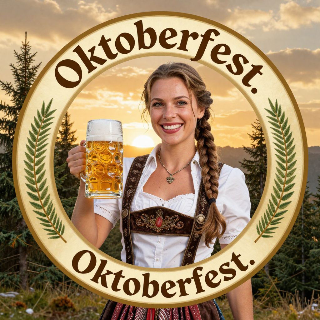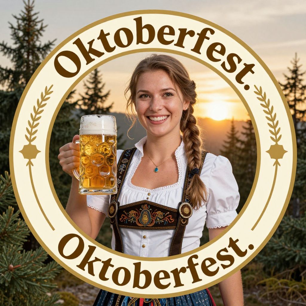 Smiling woman in traditional Bavarian attire holding a stein of beer, set against a scenic Oktoberfest backdrop with pine trees and a golden sunset, framed within a circular emblem labeled \"Oktoberfest.\