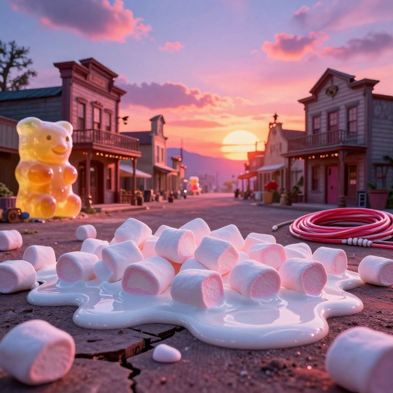 Envision an enchanting, surreal landscape reminiscent of melting timepieces, where the foreground appears as though made of gooey marshmallow fluff cascading over fractured ground. The background reveals a peculiar amalgamation of an antiquated Wild West town, with buildings constructed from colossal gummy bears and licorice lassos. A vibrant neon sunset bathes everything in a candy-coated radiance, creating a whimsical yet unsettling atmosphere that evokes a sense of nostalgia and curiosity as viewers are transported into a dreamlike realm where reality intertwines with imagination.