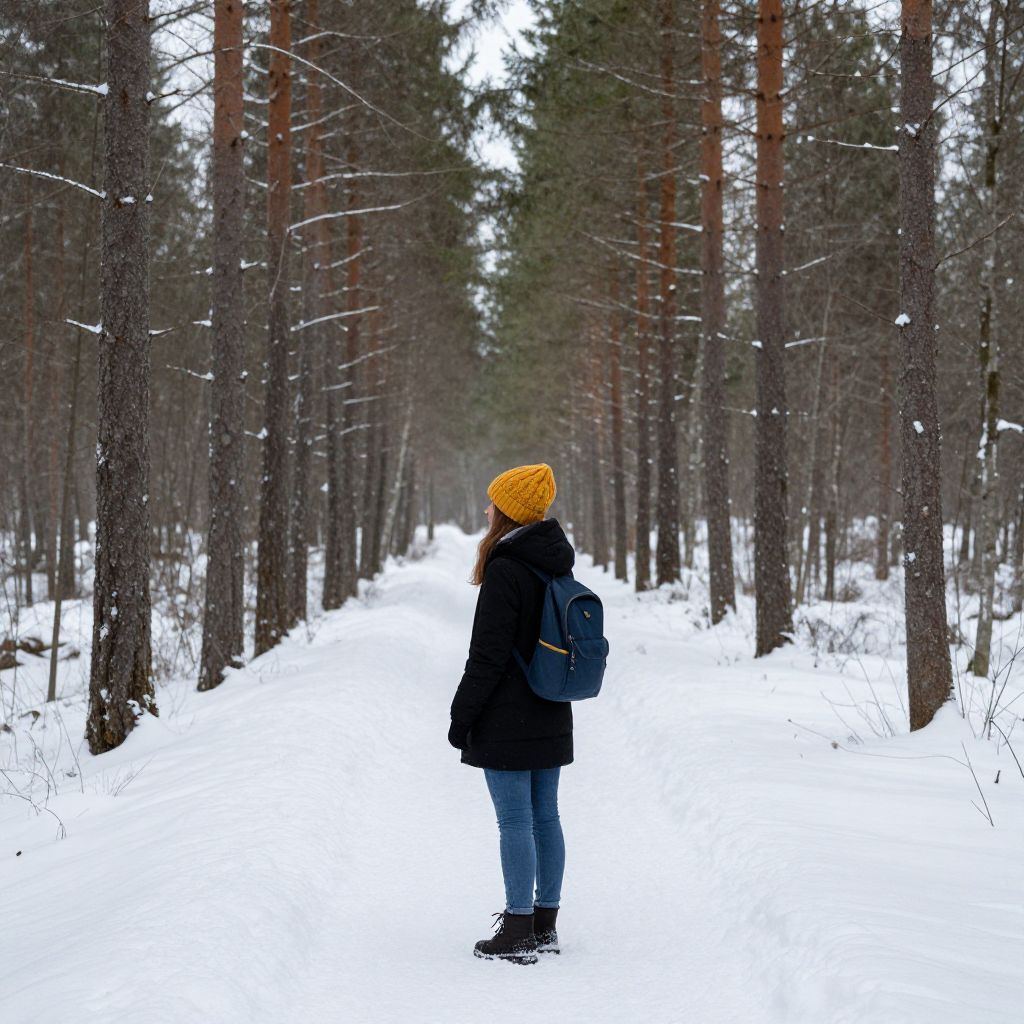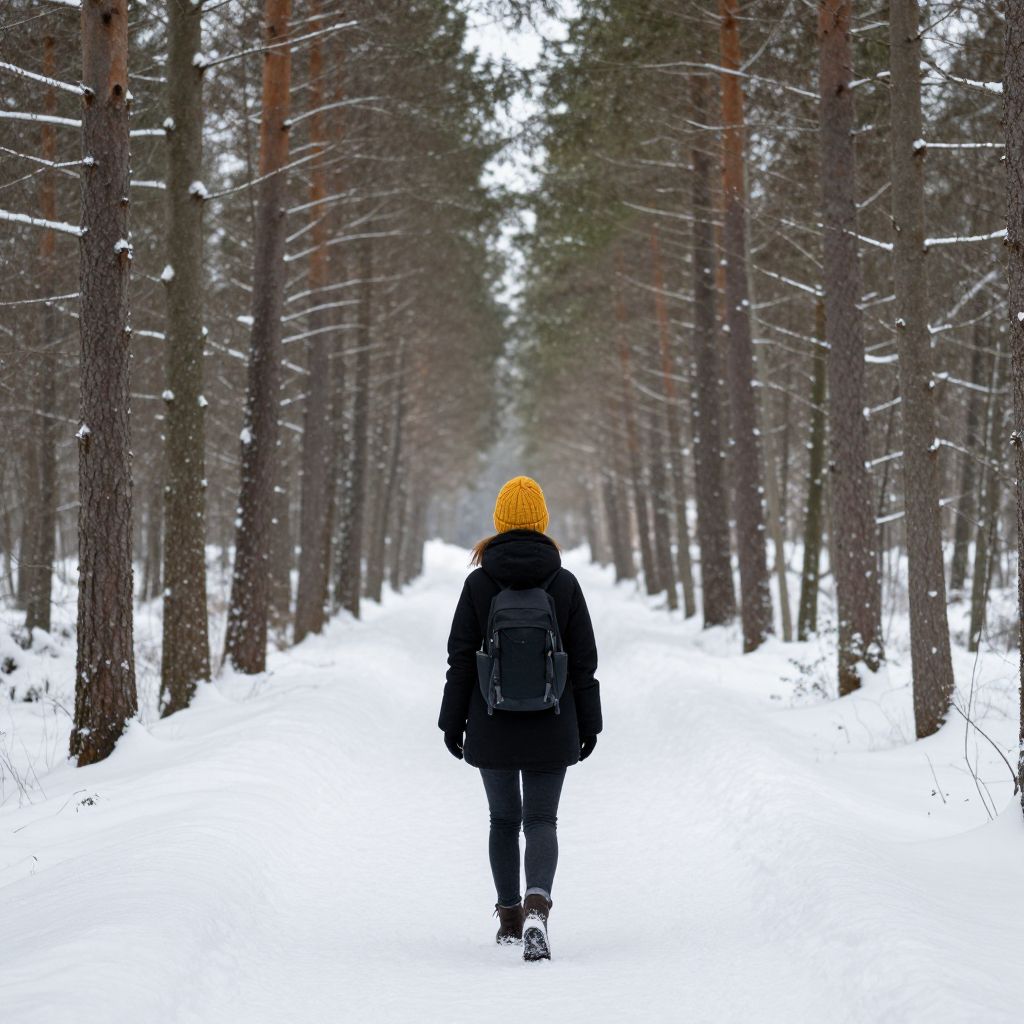 Alone young woman in black down jacket and yellow knitted hat with rucksack in the depth of the black forest during cold winter day in finland