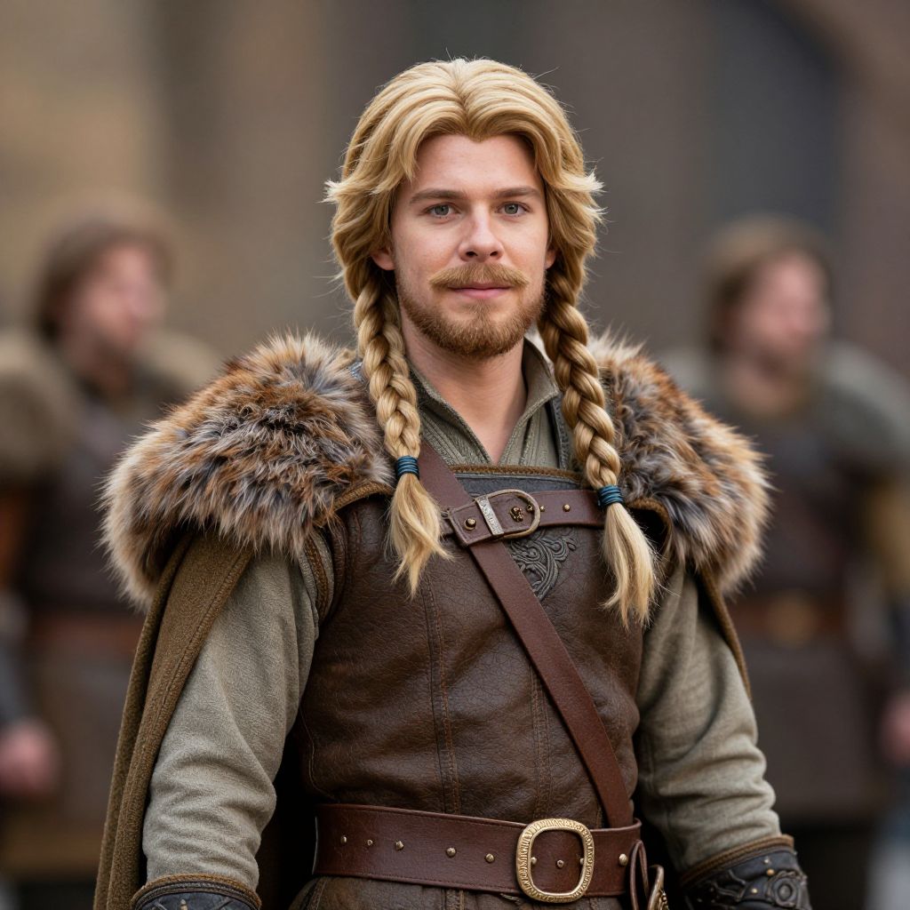 Photorealistic digital art of a blond, bearded man with braids, wearing a fur-collared, medieval-style brown leather vest, standing
