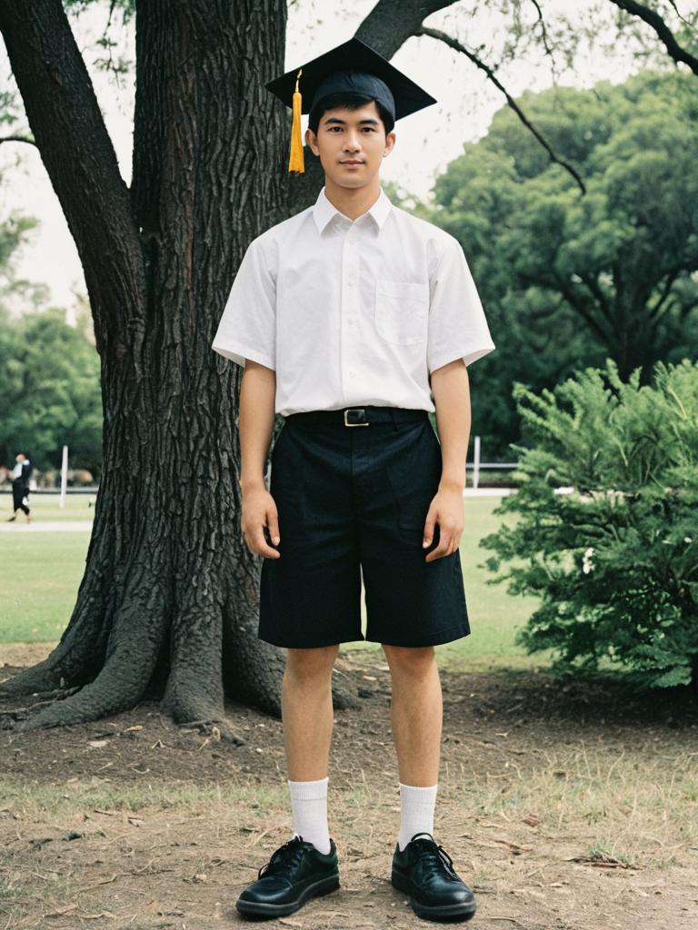 Graduation guest outfit, 1boy, male focus, solo, shirt, outdoors, shorts, white shirt, black shorts, full body, collared shirt, hat, standing, looking at viewer, tree, black hair, day, black footwear