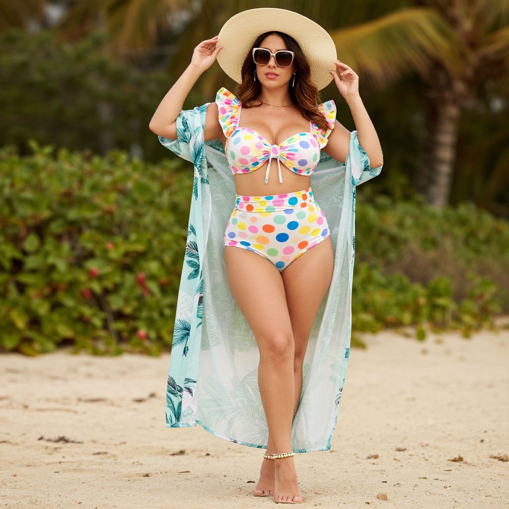 Photograph of a curvy woman with tan skin, wearing a colorful polka dot bikini, open floral robe, straw hat, and sunglasses, walking