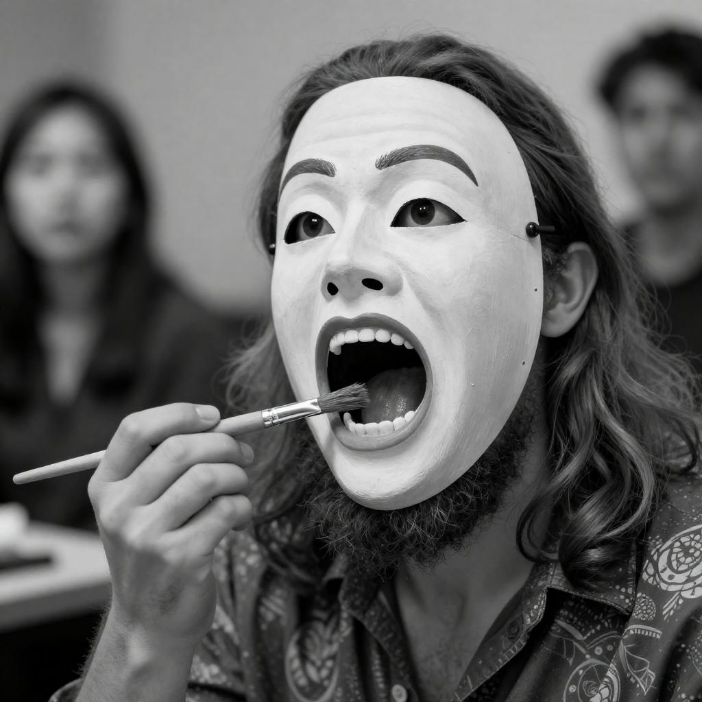 Black-and-white photograph. Bearded man with long, wavy hair, wearing patterned shirt, painting exaggeratedly open-mouthed face mask. Man holds paintbrush in mouth, concentrating. Mask has bulging eyes, wide open mouth, teeth. Background blurred. Two people. Intense expressions.
