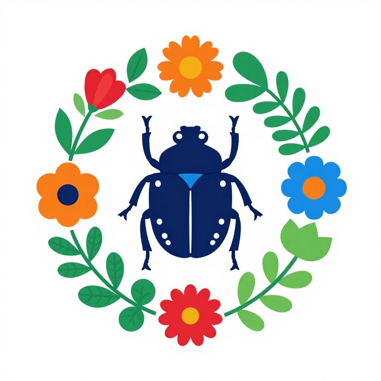 The image is a vibrant, flat design icon representing biodiversity, reminiscent of Milton Glaser's iconic style. Set against a white background, the composition features a circular arrangement of various plant and insect elements. At the center, a dark blue beetle with white spots and a white line down its back is prominently displayed. Surrounding the beetle are colorful flowers in shades of red, orange, and blue, as well as green leaves with intricate vein patterns. The flowers and leaves are arranged in a balanced, symmetrical manner, creating a harmonious and visually appealing composition. The overall design is simple yet detailed, with a focus on the interplay of colors and shapes to convey the concept of biodiversity.