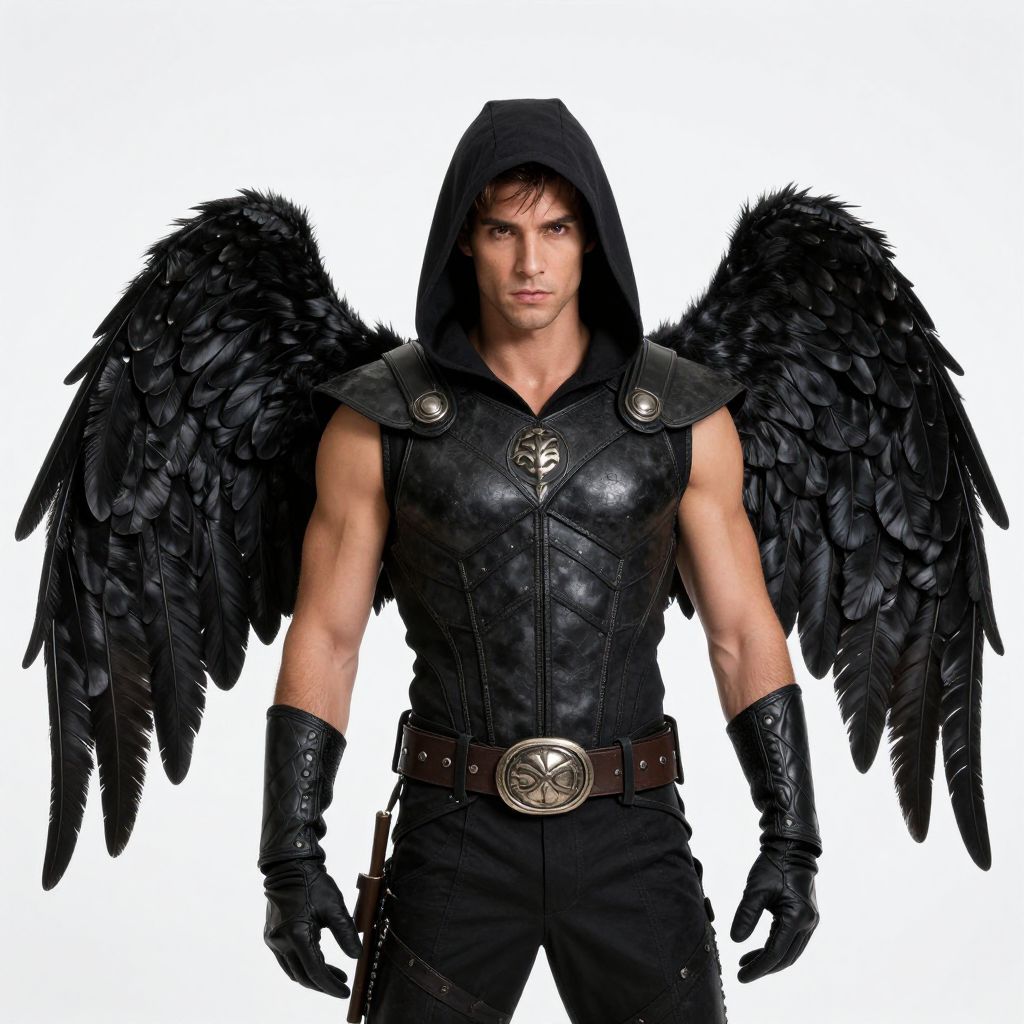 Photograph of a muscular, white male with dark brown, shoulder-length hair, standing against a white background. He wears a black leather hooded vest with silver circular shoulder plates, black gloves, and black pants with a wide brown belt featuring a large, ornate silver buckle. His most striking feature is a pair of large, black feathered wings extending from his back. His expression is intense, with piercing eyes looking directly at the camera. The image has a fantasy, gothic style, emphasizing his supernatural, angelic appearance. The textures of the leather and feathers are detailed and realistic.