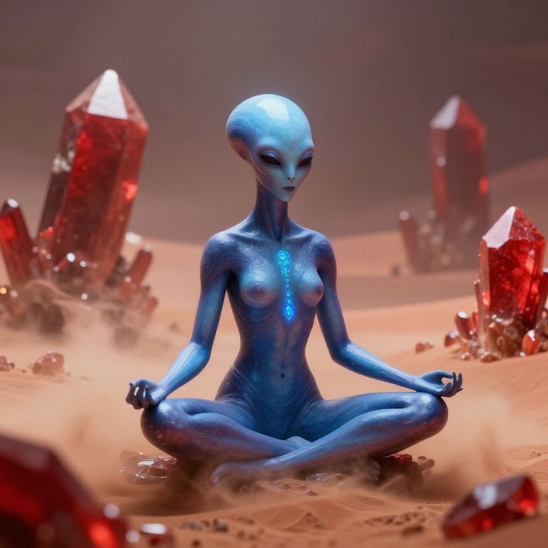 Photorealistic CGI image of a blue-skinned, nude, alien woman with an elongated head and glowing blue eyes, sitting cross-legged in a desert-like setting. She has small, firm breasts and a slender, athletic build. A blue, luminescent line runs down her chest. Surrounding her are large, red crystalline formations that reflect light. The sand beneath her is dusty and orange. The alien's expression is serene, and her hands rest on her knees in a meditative pose. The background is blurred, emphasizing the detailed textures of her skin and the crystals.