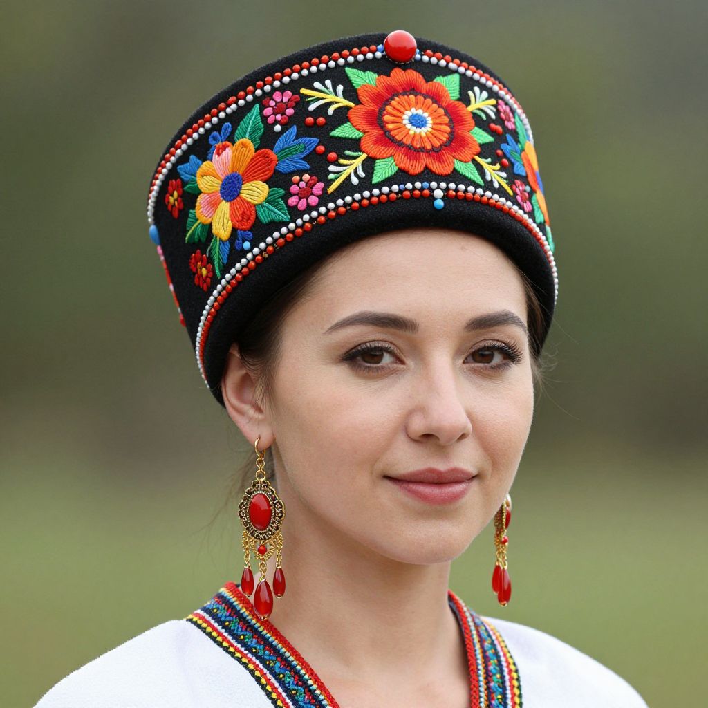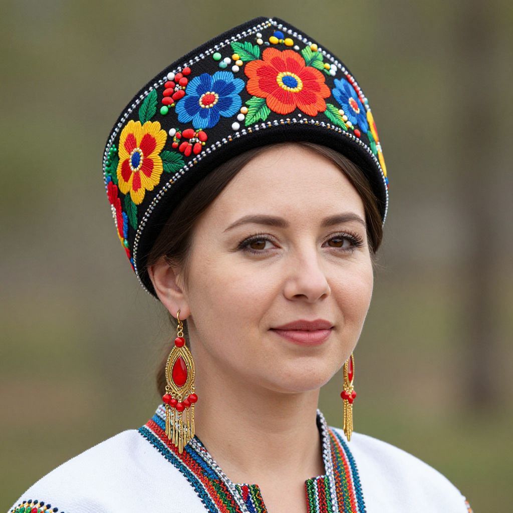 Woman wearing a vibrant traditional Ukrainian hat adorned with intricate floral embroidery and colorful beads, complemented by long, dangling earrings featuring red and gold accents, showcasing the timeless beauty and cultural heritage of ancient traditions.
