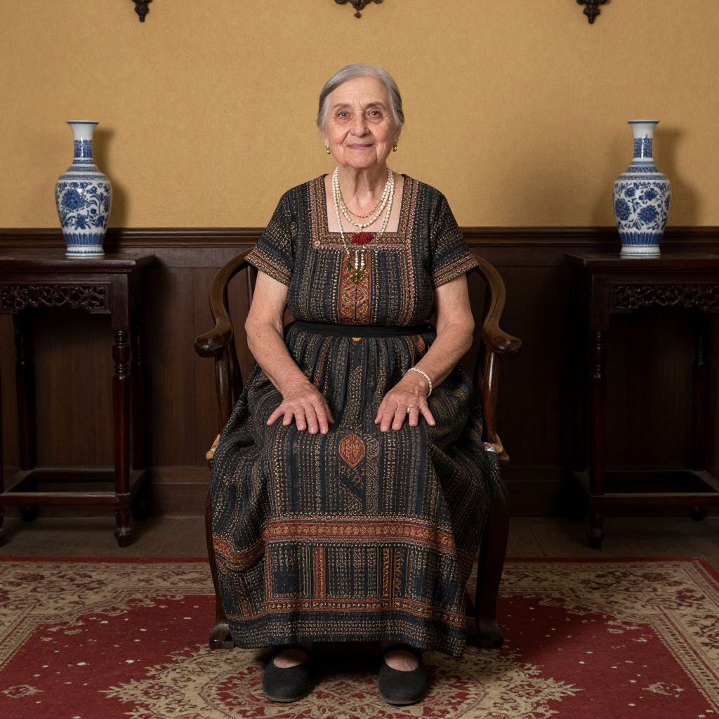 Elderly woman with gray hair, wearing black embroidered dress and pearl necklace, seated in ornate wooden chair, flanked by blue-and-white v