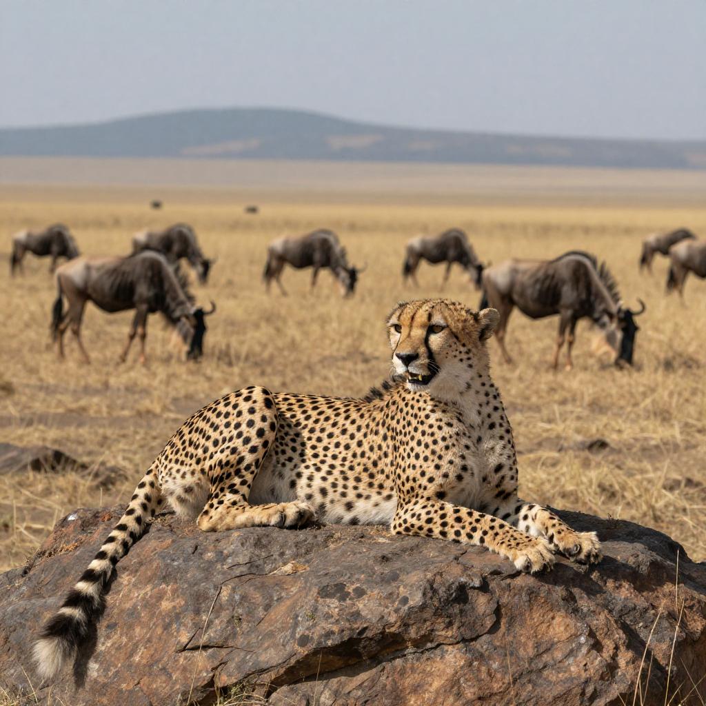 Photograph of a relaxed cheetah lounging on a large rock in the middle of a vast, dry savanna. The cheetah's spotted coat is vivid, with its head turned slightly to the side, mouth open, showing its teeth. In the background, a herd of wildebeests grazes on the golden grass. The distant horizon features gentle hills under a pale blue sky. The cheetah's long tail drapes over the rock's edge.