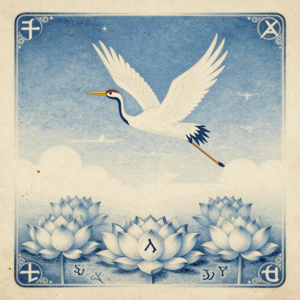 Minimalist abstract woodcut illustration featuring a white geometric crane in flight above pale blue lotus blossoms adorned with mystical glyphs. The serene scene includes a soft ivory and cerulean color palette with fine crosshatching and chiaroscuro on an aged parchment background. The composition is framed by an ornate tarot-style border with arcane sigils, gold ink flecks, and a mystical, hand-engraved look.