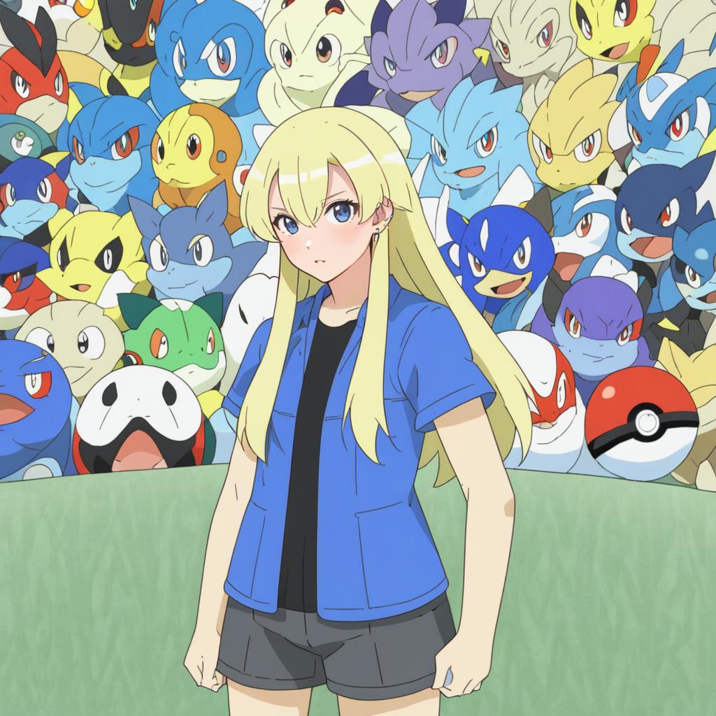 Anime-style illustration featuring a blonde-haired girl with green eyes wearing a white shirt and green shorts standing next to the Pokémon Alolan Exeggutor and Exeggcute. The Pokémon characters portray tropical, tree-like features with the iconic long neck and multiple faces of Alolan Exeggutor and the round shape of Exeggcute. The art style is vibrant and detailed, set against a warm, sandy background.