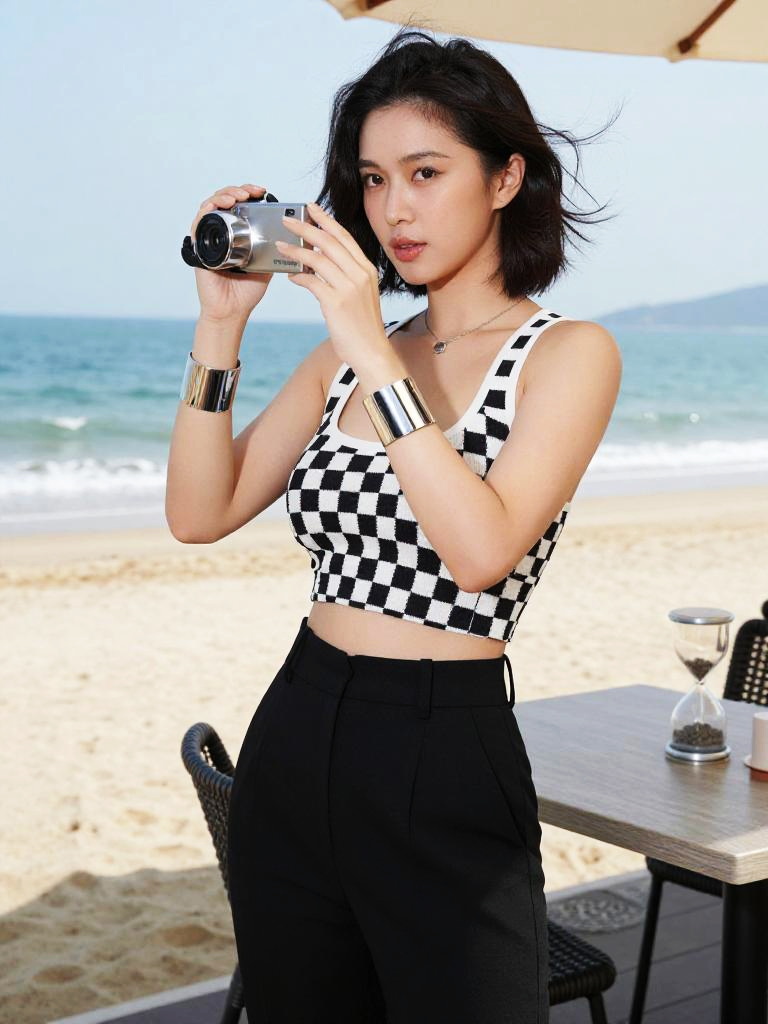 A hourglass woman in a chic, cropped black and white checkered tank top and high-waisted black trousers, stands confidently at a cafe by the beach, capturing the moment with a cameraphone. A metallic silver cuff bracelet glimmers on her wrist as the ocean breeze tousles her hair. Sexy. Pretty face and beаutiful eyes. Big breasts