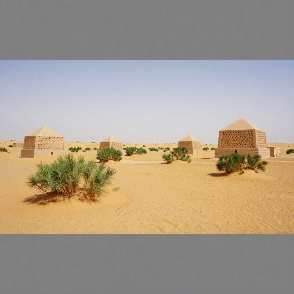 Photograph of a sunlit desert landscape featuring several traditional, beige, stone-roofed huts scattered across golden sandy dunes. Sparse, green shrubs are interspersed across the scene. The clear blue sky contrasts with the sandy ground. The huts, built with uniform, rectangular stone blocks, are positioned at varying distances, creating a sense of depth. The image has a rectangular border with gray edges. The overall atmosphere is arid and serene, highlighting the simplicity and isolation of the desert environment.