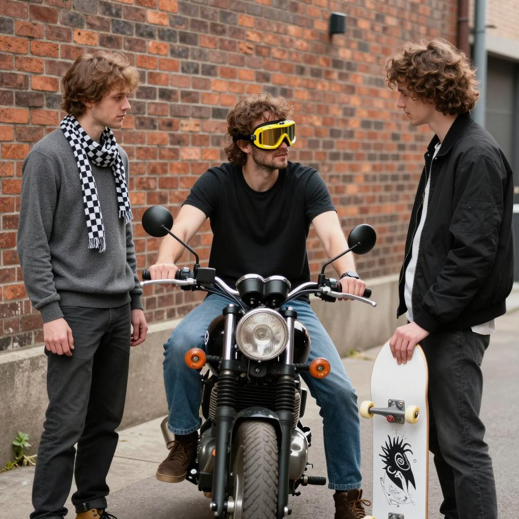 Three young men with curly brown hair in an urban alley next to a brick wall. The man in the center wearing a black shirt, blue jeans, and yellow goggles is sitting on a black motorcycle holding the handlebars. On the left, a man is standing in a grey sweater and checkered scarf. On the right, a man in a black jacket and dark pants is standing holding a white skateboard with a black graphic design.