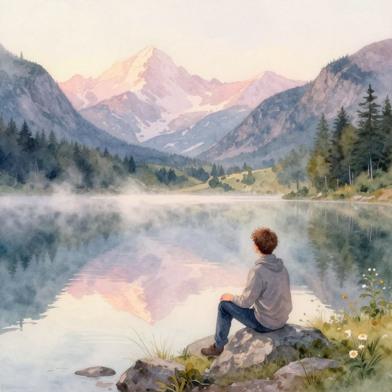 Norly, serene mountain landscape at dawn, a lone traveler in traditional robes walking a narrow trail, mist rising from a river below, pine trees and rocky peaks in the background, soft pastel colors, detailed textured brushstrokes, peaceful mood