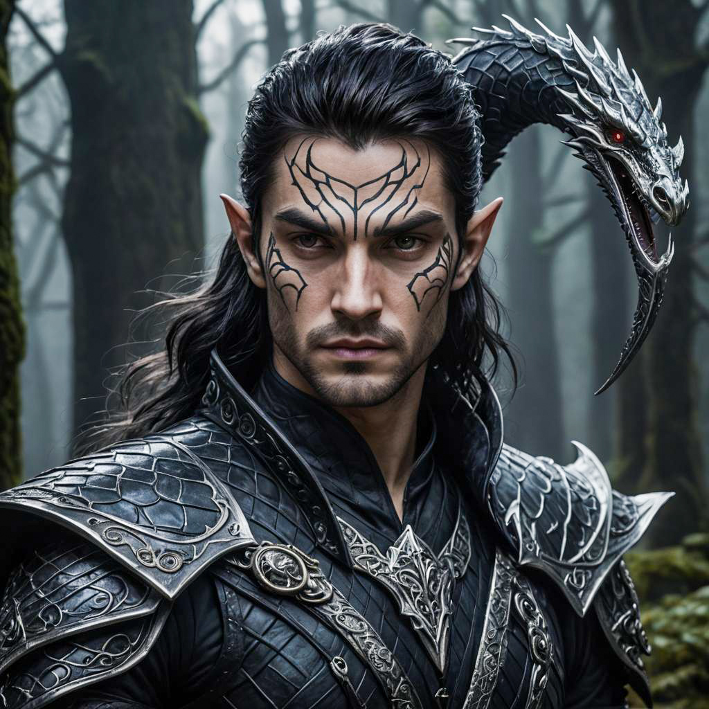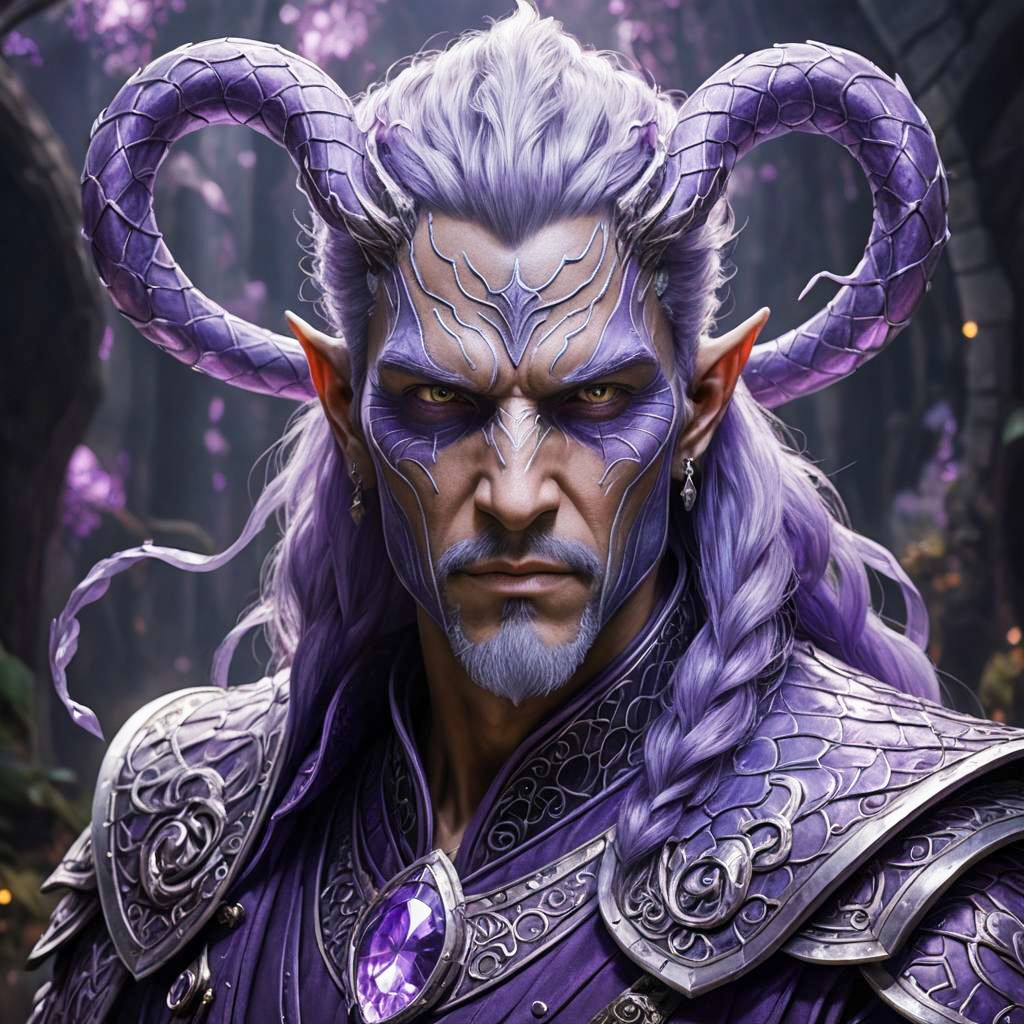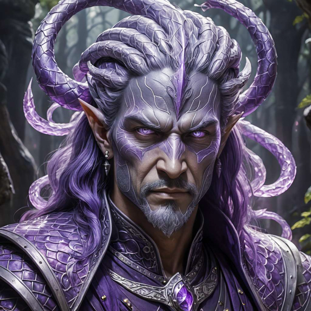 Detailed digital fantasy portrait of a non-binary gorgon wizard featuring silver and lavender snake-like scales. The character has striking lavender hair and sharp facial features with intricate scale patterns, wearing ornate armor with a large purple gemstone. The wizard's intense gaze and sinister aura are emphasized by dramatic lighting in a mystical forest setting.