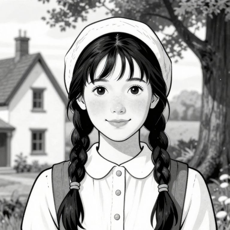 A black and white illustration of Anne of Green Gables, featuring her iconic pigtails and a hat, with a house and a tree in the background.