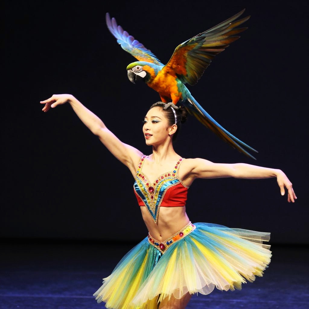 Ballet dancer with colorful parrot on head