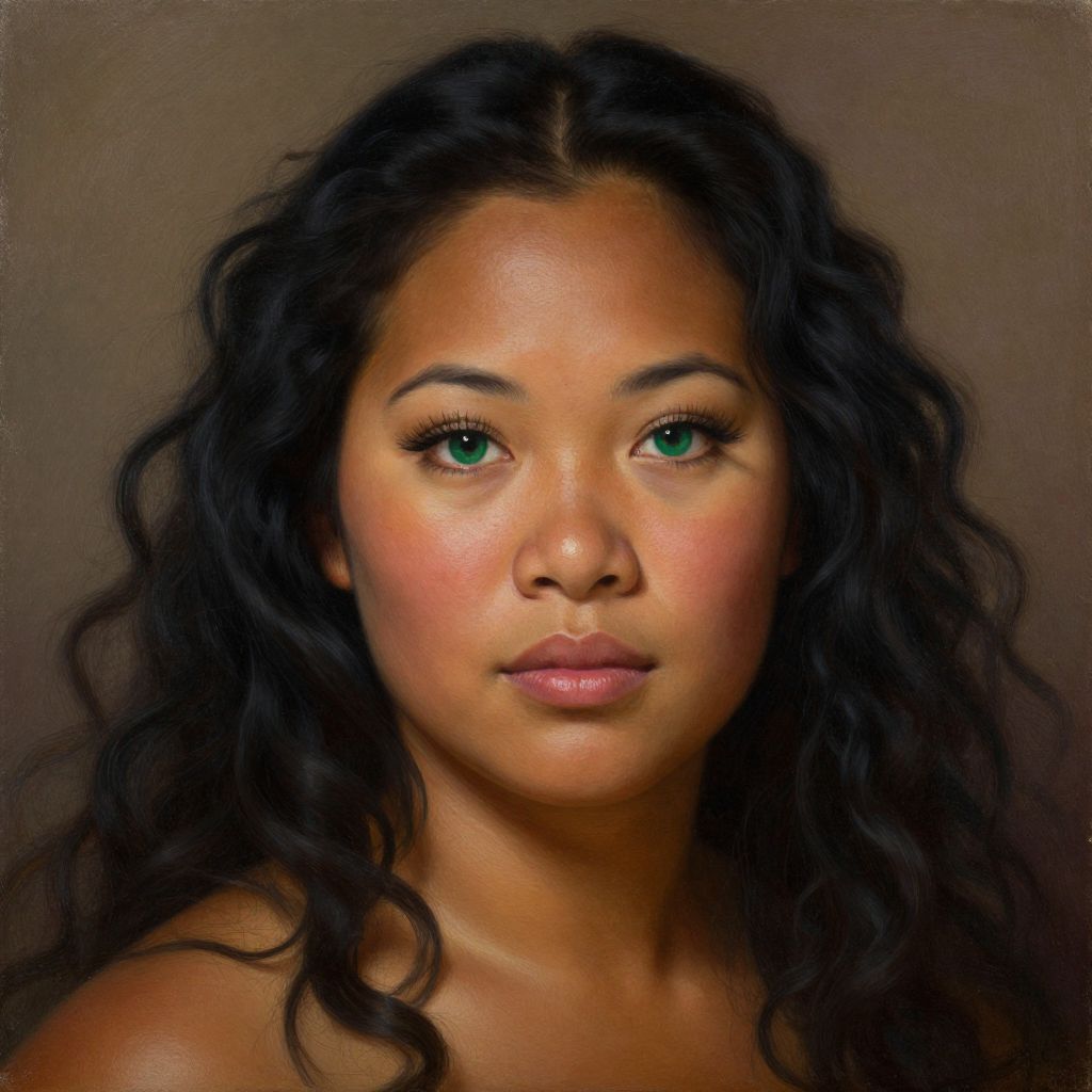 Craft a hyper-realistic oil painting portrait of a Pacific Islander woman with warm honey-brown skin and piercing emerald eyes. Her calm confidence exudes as she meets the viewer's gaze directly beneath her long curly lashes. Soft lighting highlights her high cheekbones, adding a subtle glow to her smooth olive complexion. The East Asian woman's luxurious jet-black hair falls in loose ringlets over her shoulders, with wisps framing her face and enhancing her ethereal beauty. This captivating scene is captured from an unusual angle, akin to a 'bug's-eye view,' drawing the audience closer to witness her unspoken strength and grace, frozen in time.
