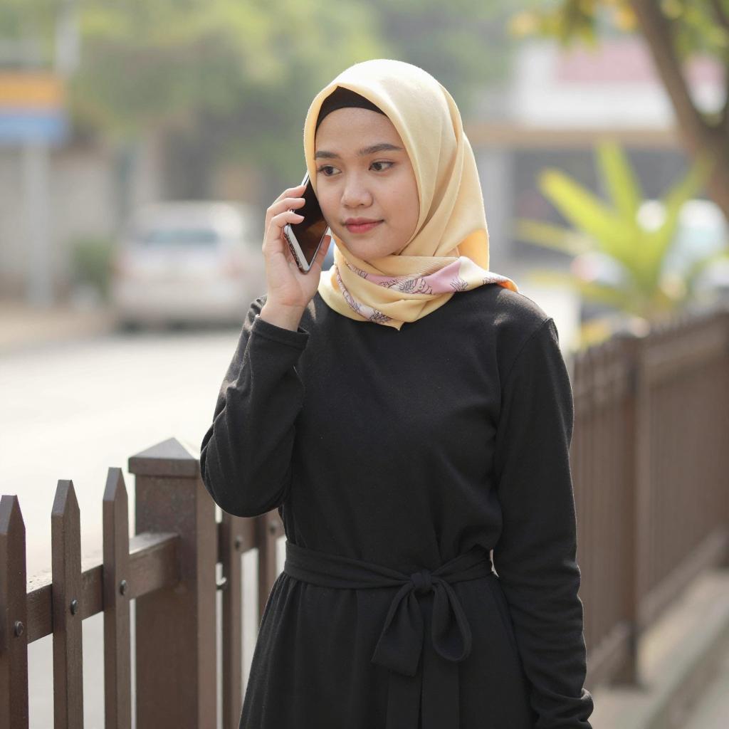 Photograph of a young Asian woman with light skin and blonde hijab, wearing a black long-sleeve top and black skirt with a tied belt. She holds a phone to her ear with her right hand, standing against a wooden fence in a sunlit, blurred outdoor setting. A yellow scarf with pink patterns is around her neck.