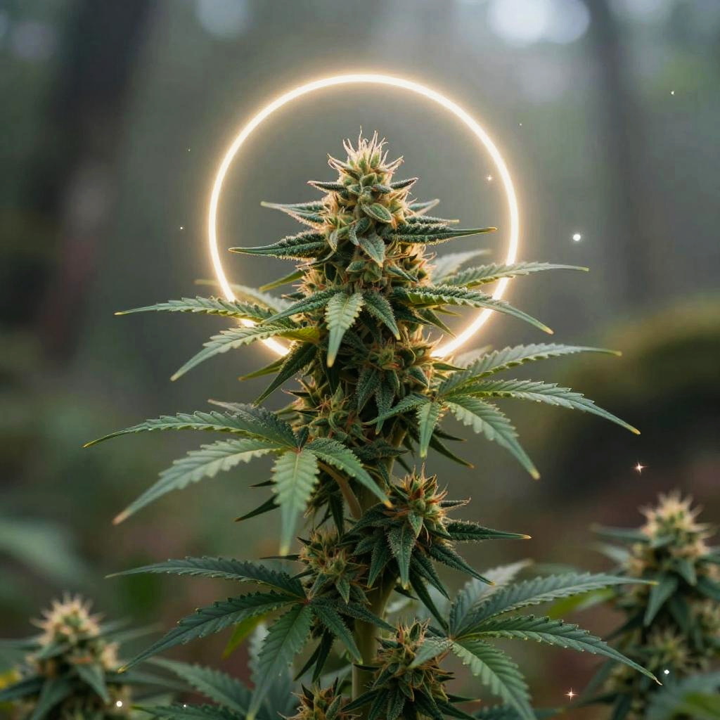 Halo cannabis photos featuring a glowing cannabis plant bathed in ethereal light, with soft halo rings highlighting the leaves and buds, set in a mystical forest environment with gentle fog and sparkling particles, capturing a magical and serene vibe.