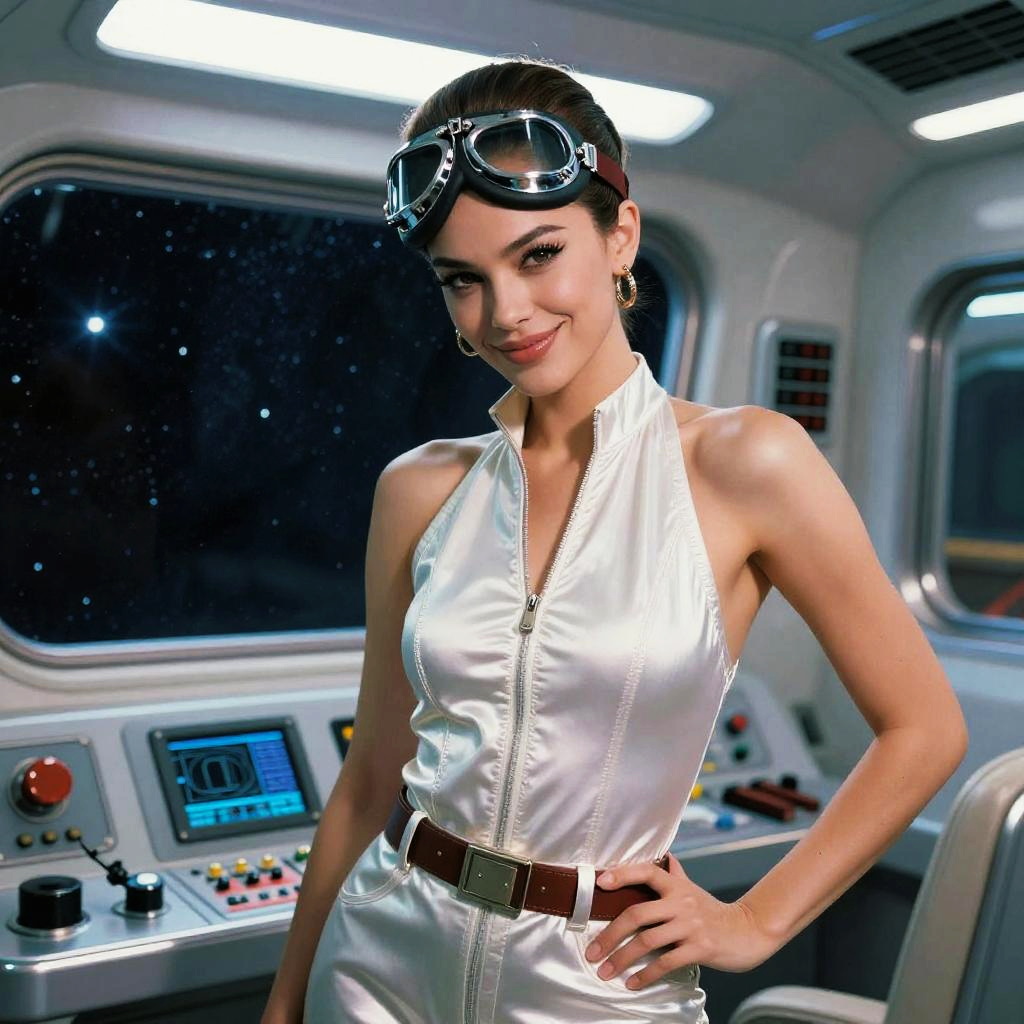 A high-resolution digital mid-century modern poster portrait set in a slick 1960s cocktail lounge, featuring a cocktail waitress with retro bob and bold eyeliner. Wardrobe leans retro—halter silhouette dress with pearl earrings. Confident head tilt, playful smile or smoldering gaze, polished posture. Cohesive props and scene details (martini glass, chrome bar stools) enrich the narrative. Dramatic key with soft rim light, saturated complementary palette, subtle halftone or film grain texture, crisp edges, sharp focus, 8k detail, vintage glamour reimagined with contemporary finesse.