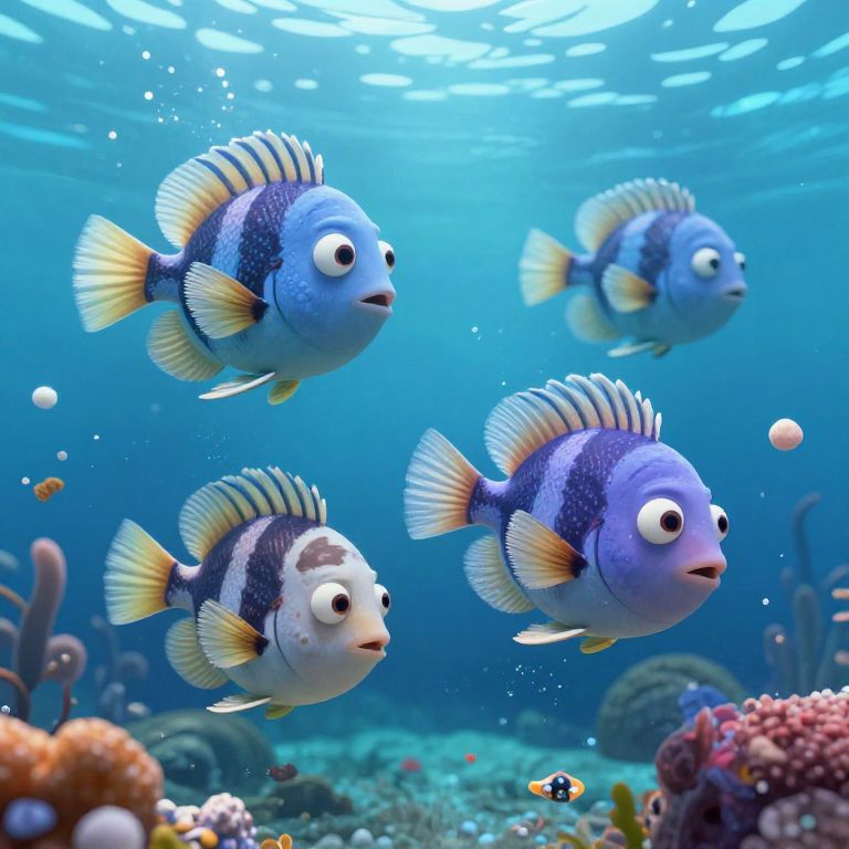 Photograph of four vibrant, cartoon-style blue fish with yellow and white striped fins swimming in a clear, underwater ocean. The fish have expressive, wide eyes and blue bodies with dark blue spots. They are surrounded by colorful coral reefs with various corals and small fish in the background. Sunlight filters through the water from above, creating a bright, blue-tinted scene with bubbles rising. The image has a whimsical, animated feel, with a clear emphasis on the lively sea life.