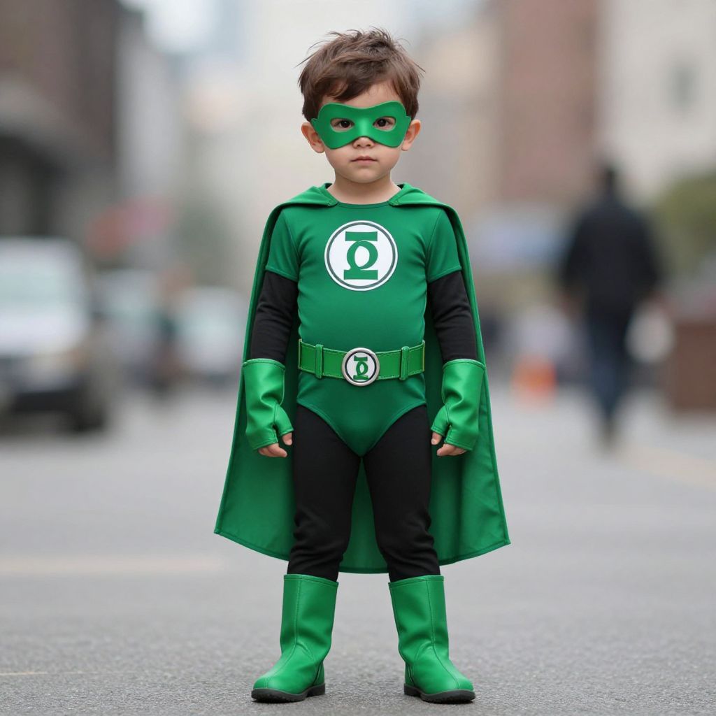 "toddler green lantern, 1boy, male focus, solo, cape, gloves, green footwear, superhero, fingerless gloves, belt, mask, boots, brown hair, full body, animification, blurry background, standing, green gloves, domino mask, blurry, bodysuit Realistic photo of casual sexy person with pretty face"