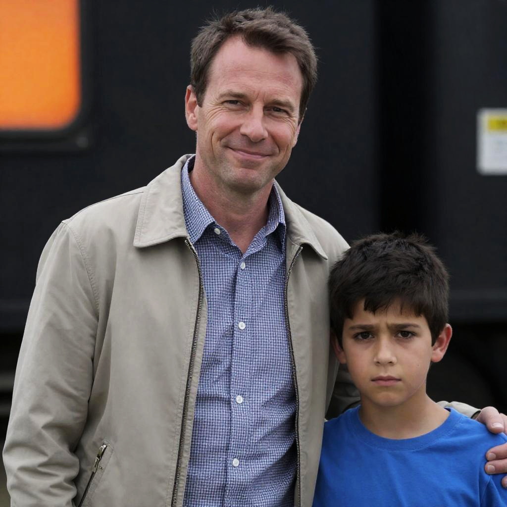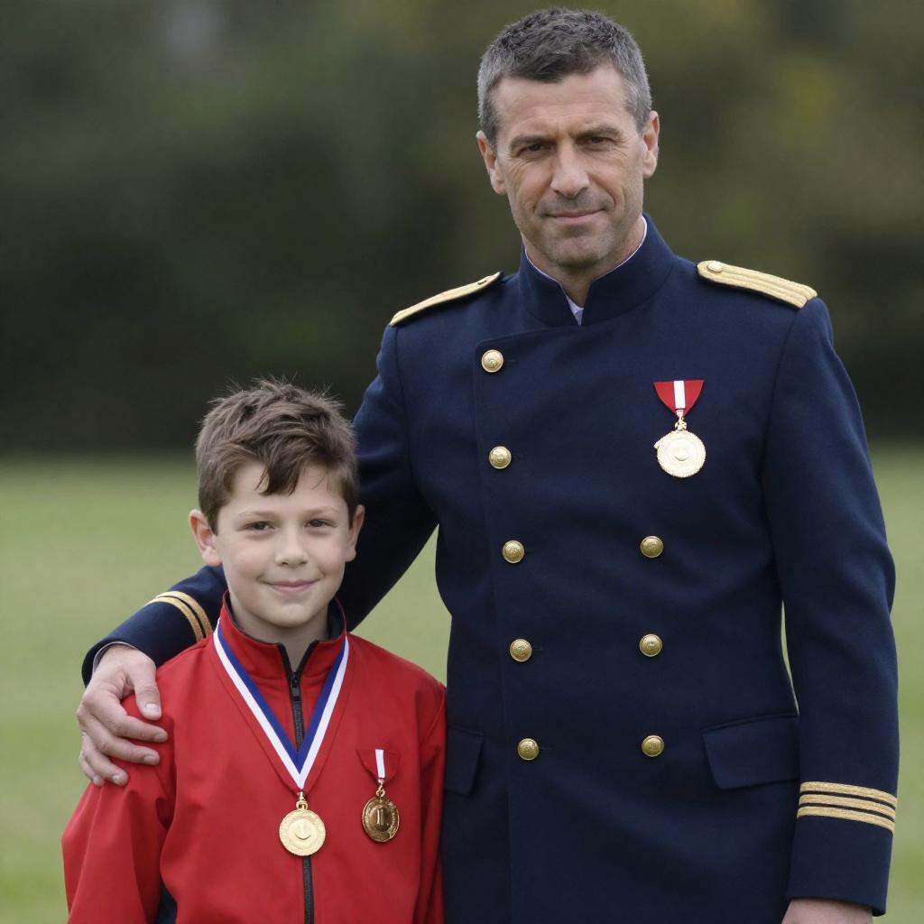 Photograph of a middle-aged man with short, dark hair in a navy double-breasted military-style coat with gold buttons and a red and white medal, standing beside a young boy with short brown hair in a red jacket with a similar medal. The man has his arm around the boy's shoulder, and they are outdoors with greenery in the background.