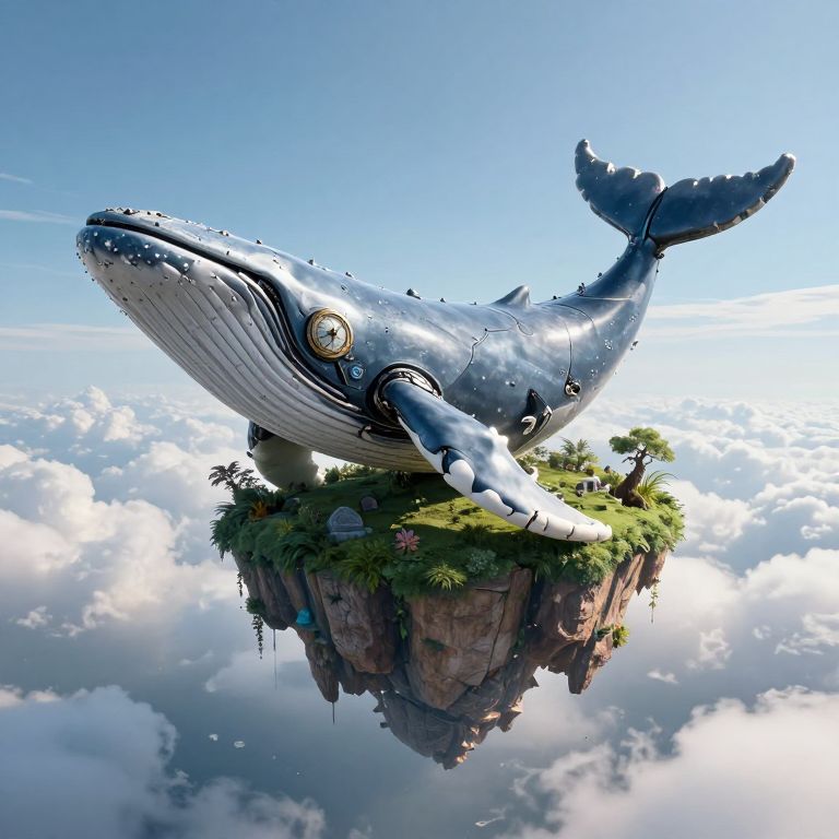 Digital illustration of a futuristic, metallic blue whale with mechanical eyes, hovering above a small, lush island with palm trees, surrounded by fluffy clouds.